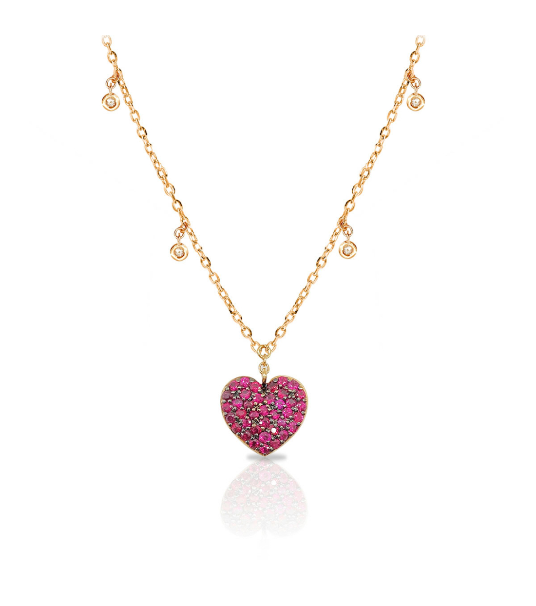 Gargantilla "Patricia" compuesta por cadena de oro rosa con chatones de diamantes talla brillante (0,08 cts) y colgante corazón de oro rosa con rubíes talla brillante (0,58 cts). Un diseño exclusivo que realza tu belleza natural.