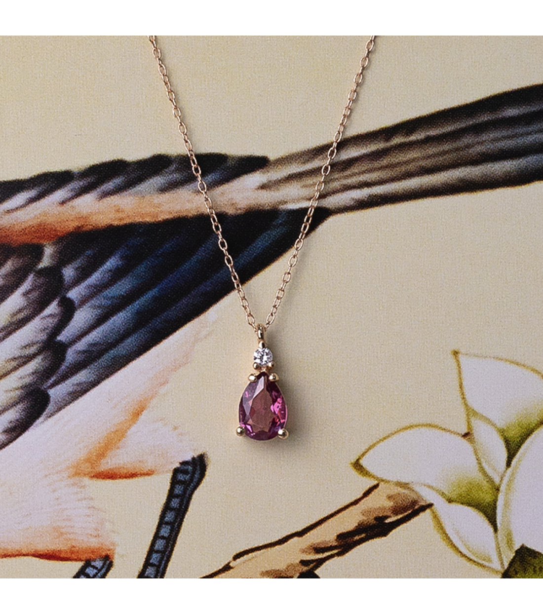 Collar "Aurora" de oro amarillo de 18Kt. con diamante talla brillante (0,03 Cts.) y rodolita talla gota. Su diseño clásico y versátil de joyería de lujo perfecto para añadir un toque de sofisticación a cualquier look.