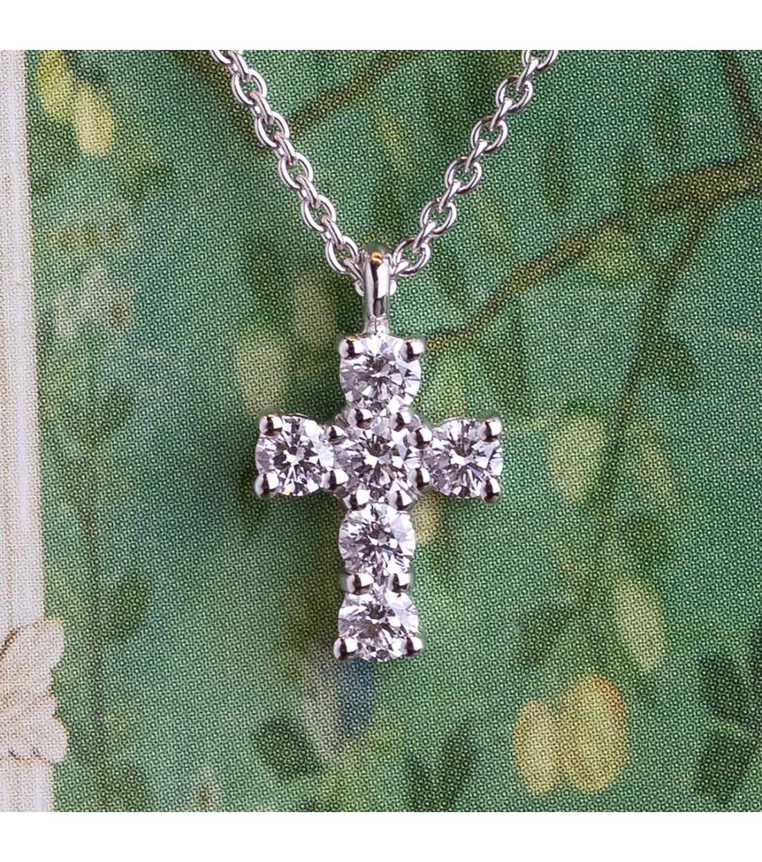 Collar "Mara" de oro blanco de 18Kt con cruz de diamantes talla brillante 0,35Cts. Un diseño clásico que irradia elegancia y espiritualidad.