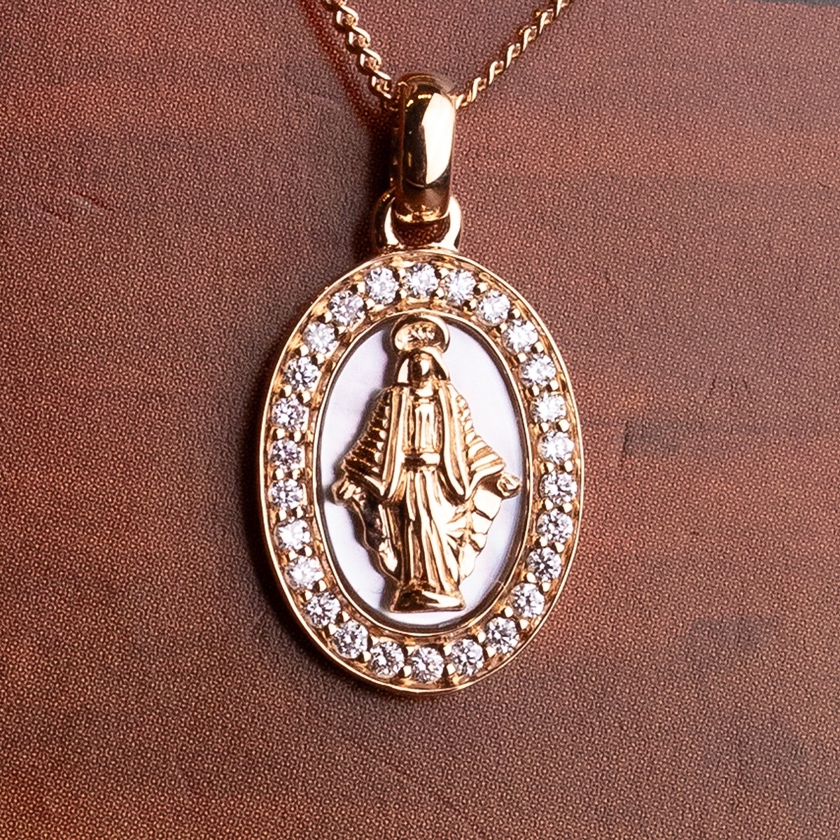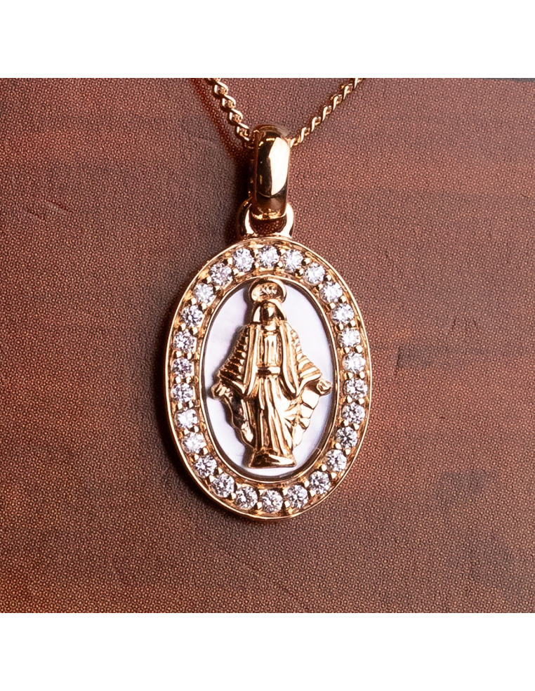 Collar "Malak" de oro rosa de 18Kt. compuesto por cadena y medalla de virgen de La Milagrosa con bisel de diamantes talla brillante 0,11Cts. y madreperla. Sofisticado y espiritual, ideal para toda ocasión.