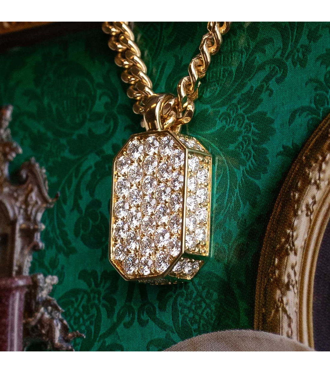 "Yuko" un exquisito collar de oro amarillo de 18 quilates abraza un colgante único, cuyo centro irradia luz gracias a una constelación de diamantes talla brillante 0,98Cts. Diseño vanguardista perfecto para cualquier estilo.