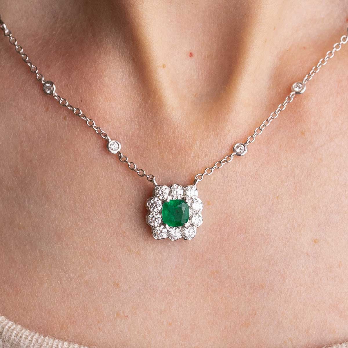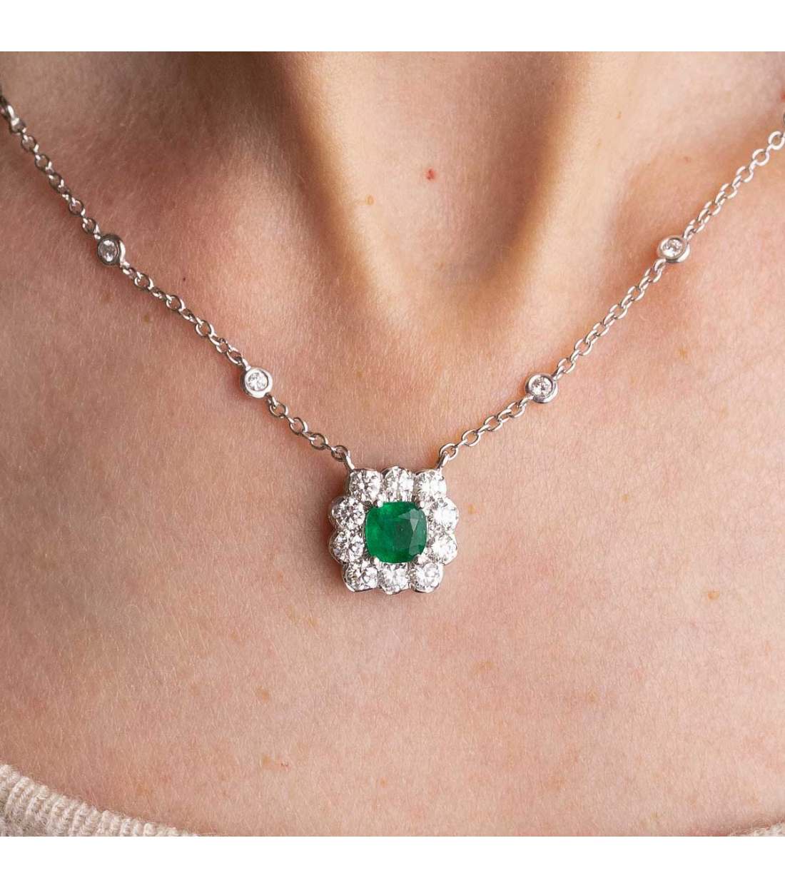 Collar "Kohana" de oro blanco de 18Kt. con esmeralda talla cojín 0,68 Cts. rodeado por bisel de diamantes talla brillante 1,02 Cts. Una declaración de amor eterno y un testimonio de un estilo sofisticado y moderno.