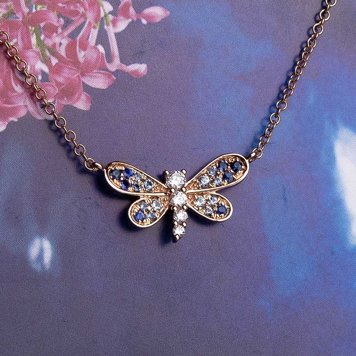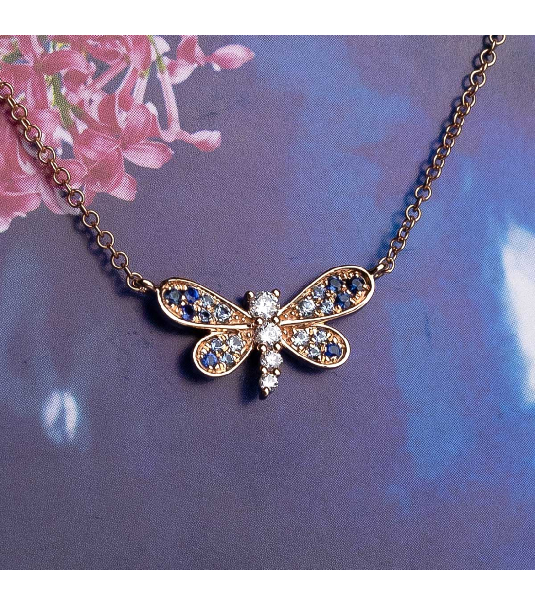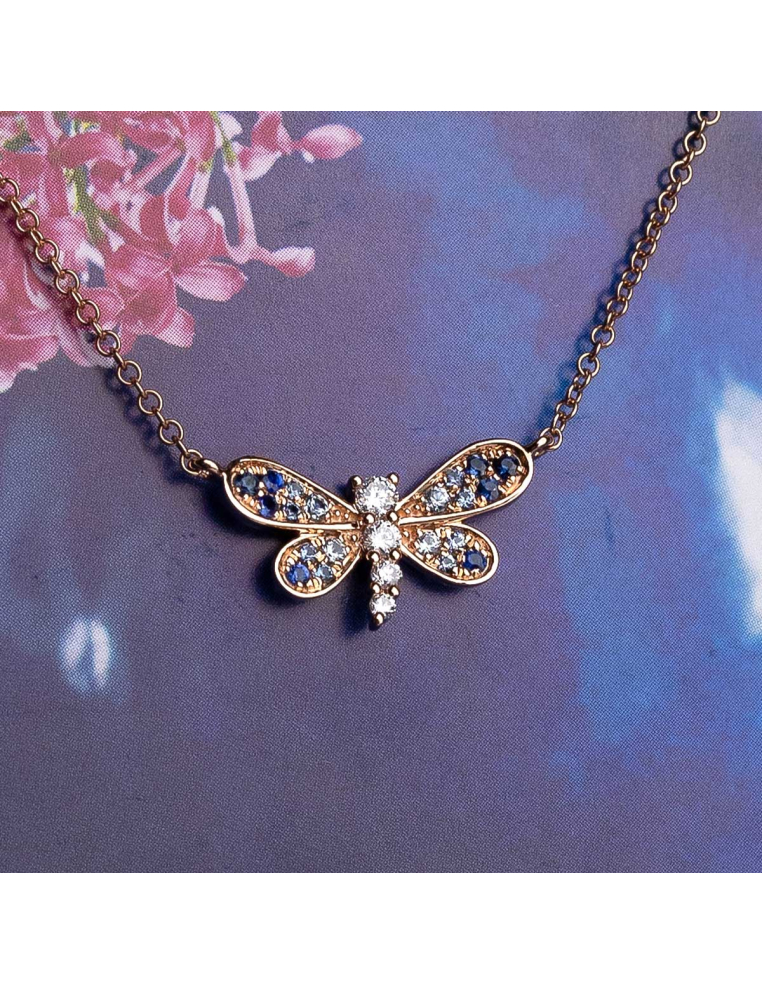 Collar "Babette" de oro rosa de 1ª Ley de 18 Kt. con mariposa engastada con diamantes talla brillante 0,10 cts. y zafiros talla brillante 0,18 cts. Capaz de elevar cualquier look con un toque poético y contemporáneo.