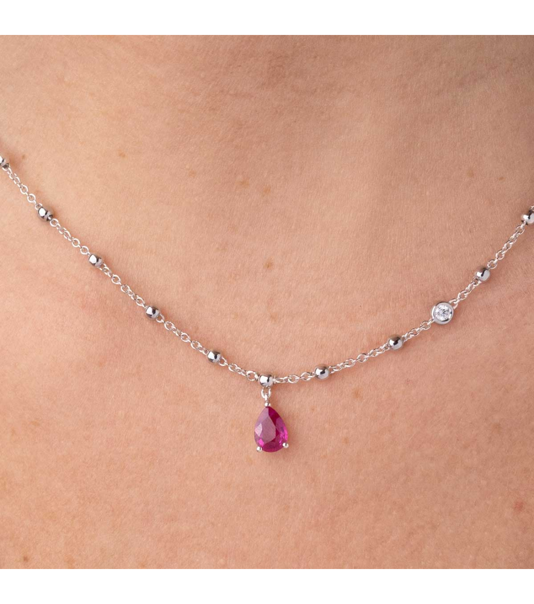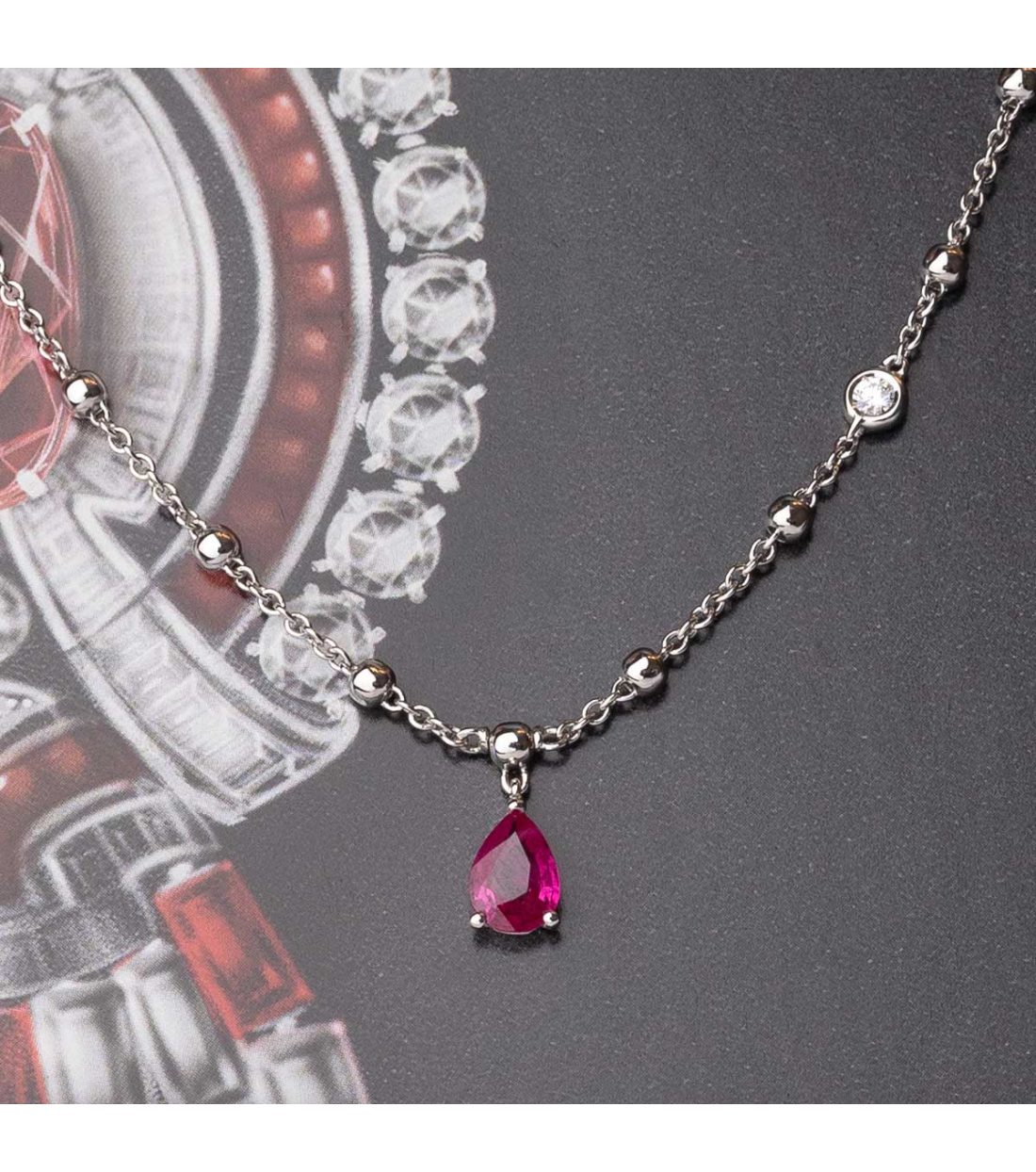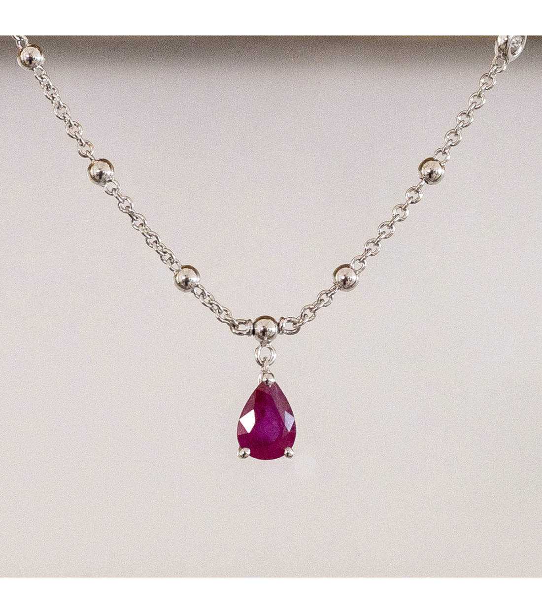 Collar "Victoria" de oro blanco de 18Kt. compuesto por cadena con diamante talla brillante 0,04 Cts. y un colgante de rubí talla pera 0,62 Cts. Un collar sofisticado, ideal para realzar cualquier look.