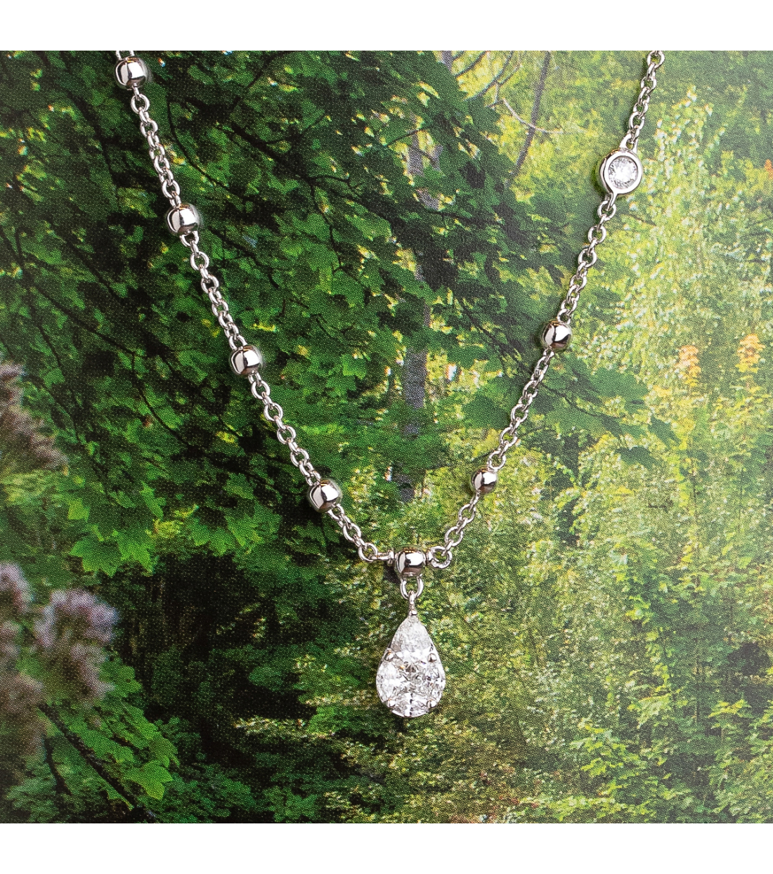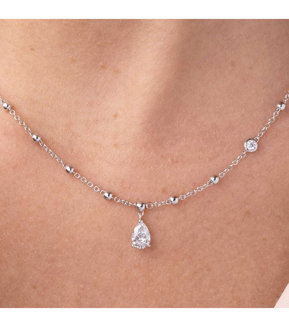 Collar "Victoria" de oro blanco de 18Kt. compuesto por cadena con diamante talla brillante 0,04Cts. y colgante de diamante talla pera 0,50 Cts. Un collar sofisticado, ideal para realzar cualquier look.