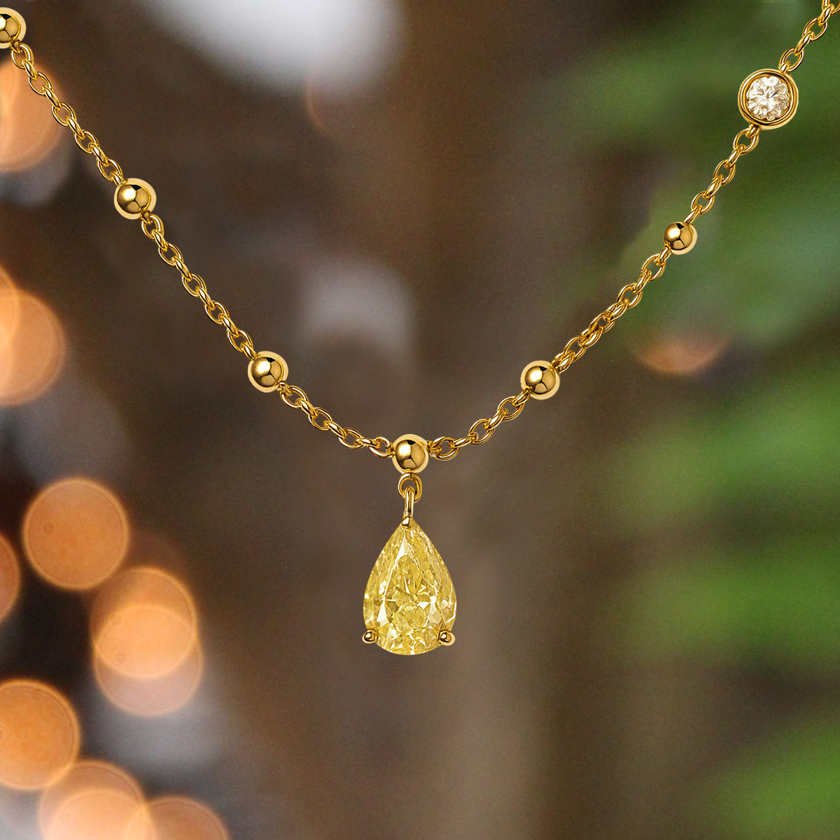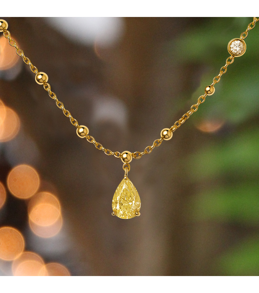 Collar "Victoria" de oro amarillo de 18Kt con diamante talla brillante 0,04 Cts. y diamante fancy talla pera 0,60 Cts. Una joya refinada y versátil que ilumina cualquier ocasión con su resplandor.