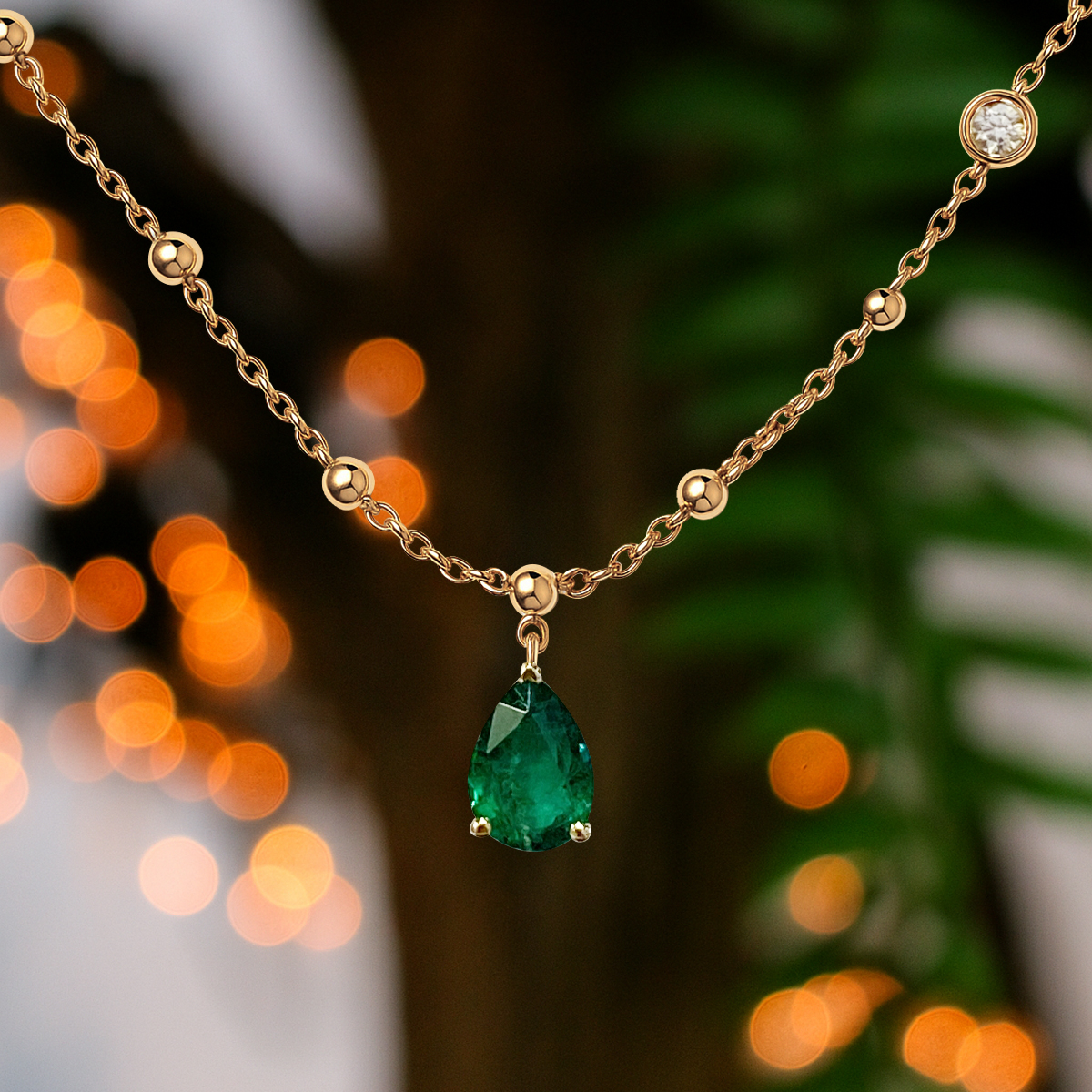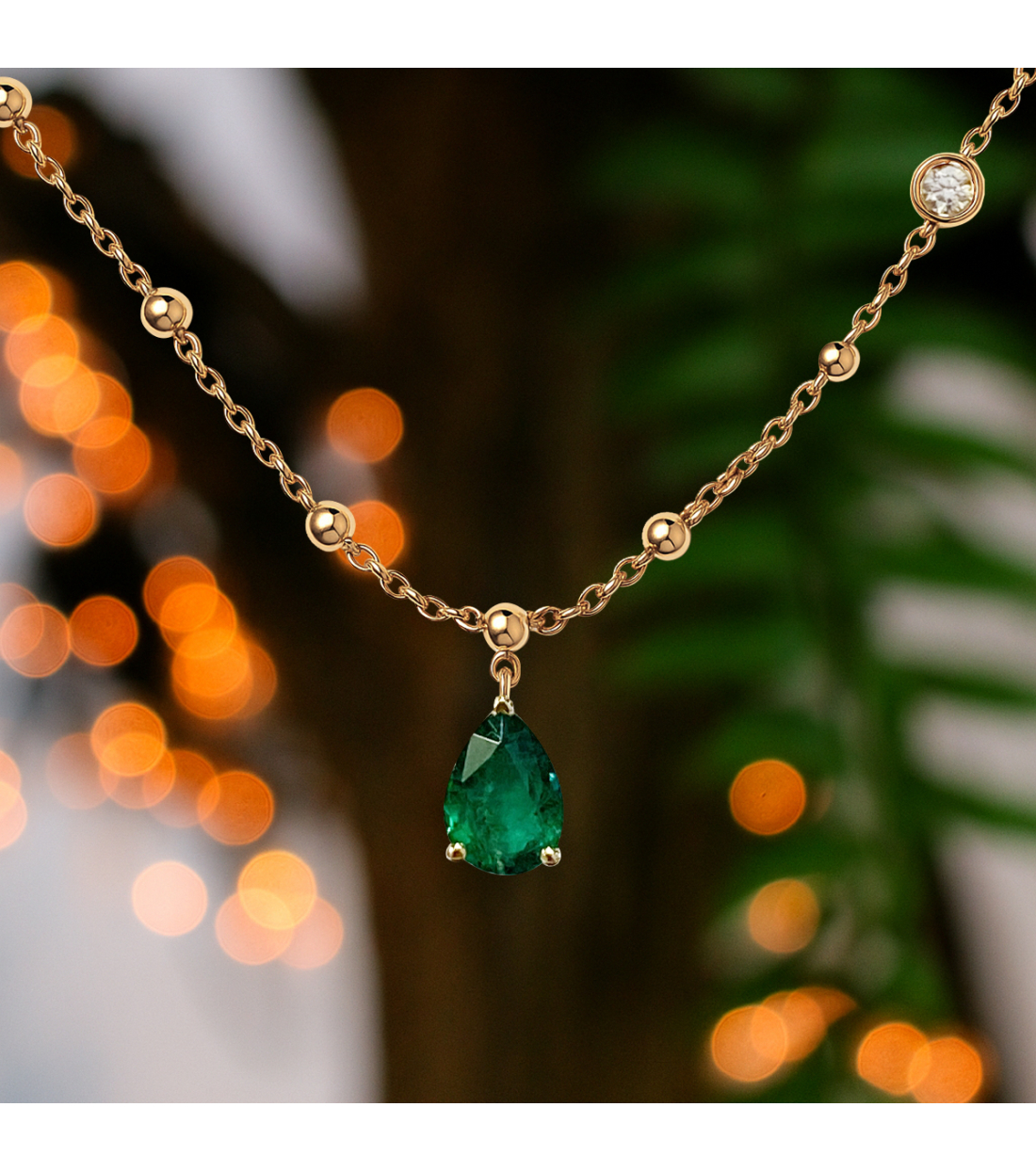 Collar "Victoria" de oro rosa de 18Kt con diamante talla brillante 0,04 Cts. y esmeralda talla pera 0,65 Cts. Una joya refinada y versátil que ilumina cualquier ocasión con su resplandor.