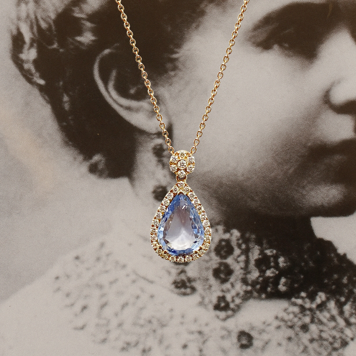 Collar "Scarlett" de oro rosa de 1ª Ley de 18Kt. con diamantes talla brillante (0,26 Cts.) y zafiro talla pera (2,42 Cts.). Símbolo de elegancia, pureza y estilo vanguardista.