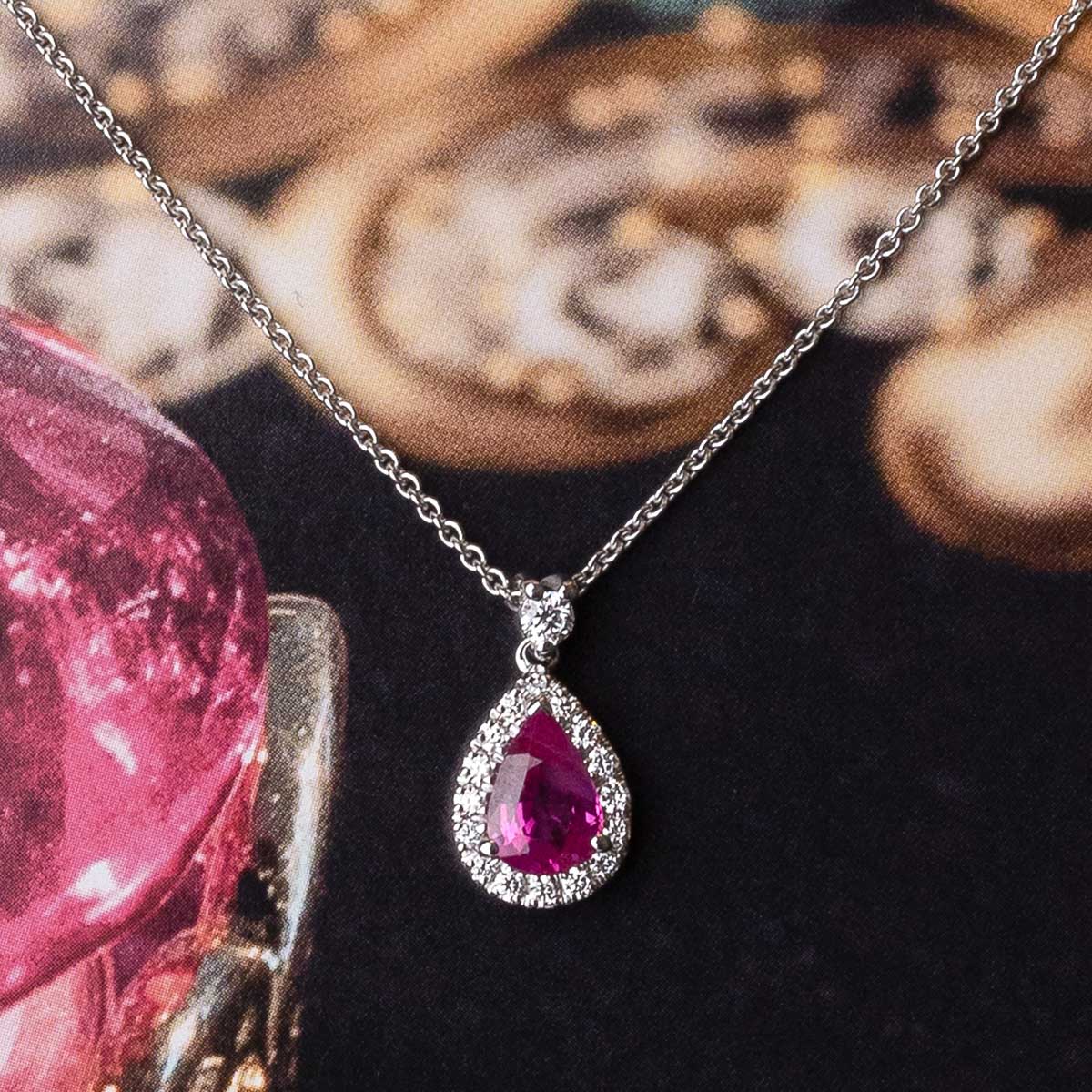 Collar "Aurora" de oro blanco de 1ª Ley de 18Kt. con diamantes talla brillante (0,20 Cts.) y rubí talla pera (0,81 Cts.). Su diseño clásico y versátil de joyería de lujo perfecto para añadir un toque de sofisticación a cualquier look.