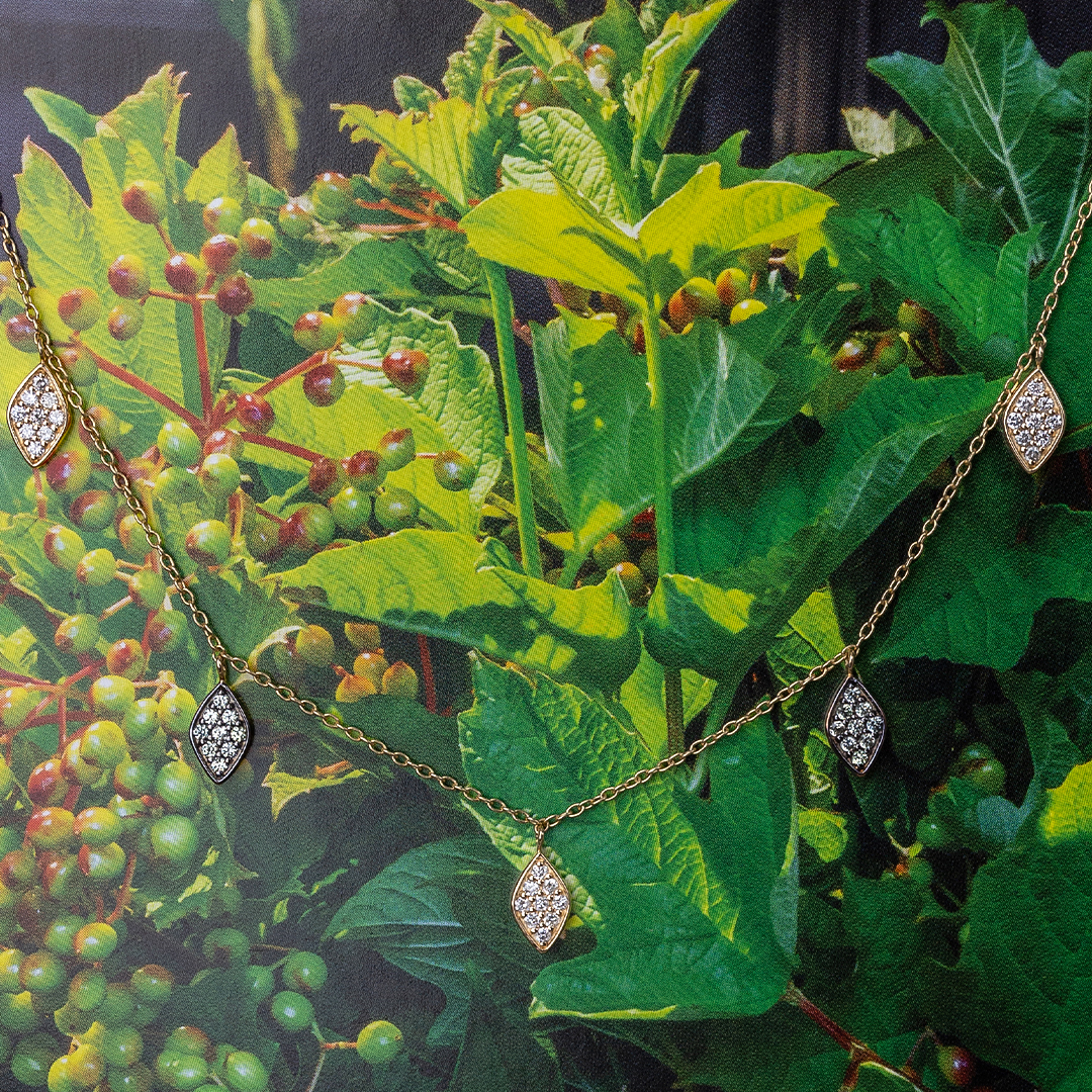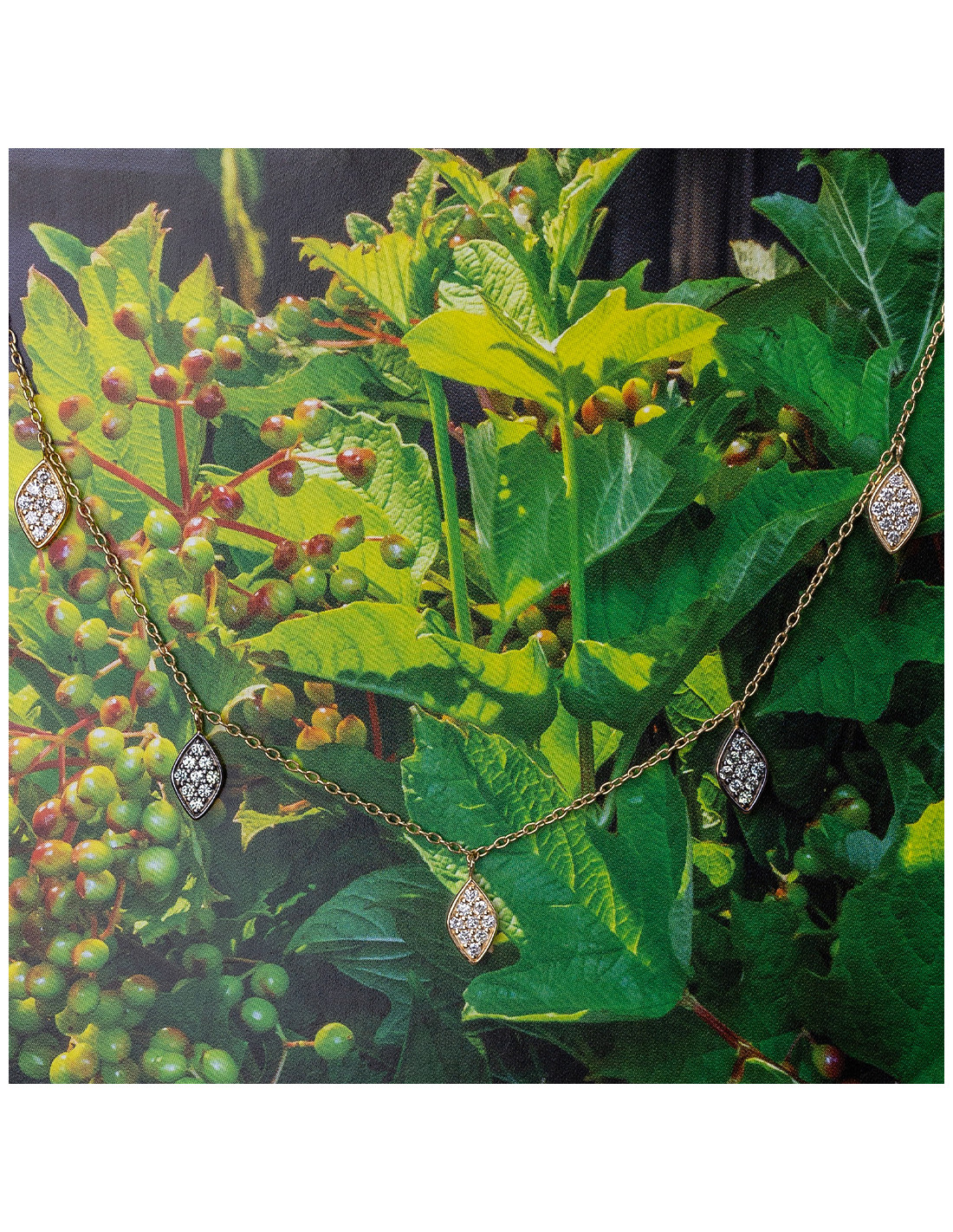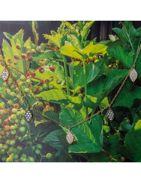 Collar "Lili" de Hojas en Oro Amarillo. Un diseño botánico elegante con cinco elementos en forma de hoja en pavé de diamantes. Perfecto para añadir un toque de sofisticación a tu look.