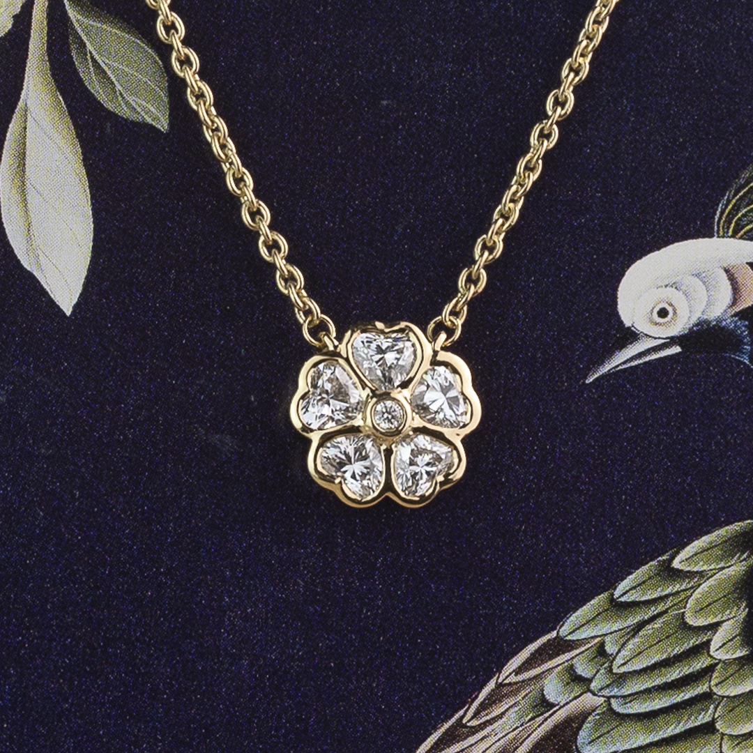 Collar "Aurora" de oro amarillo de 18 Kt. con flor de diamantes talla corazón y talla brillante. Un jardín de lujo en tu cuello.