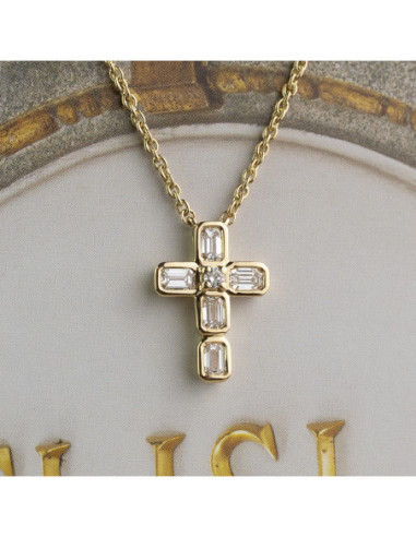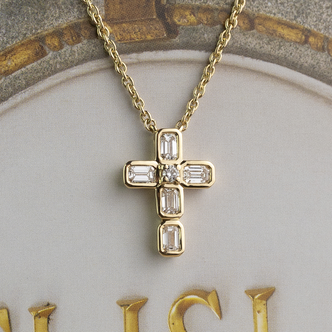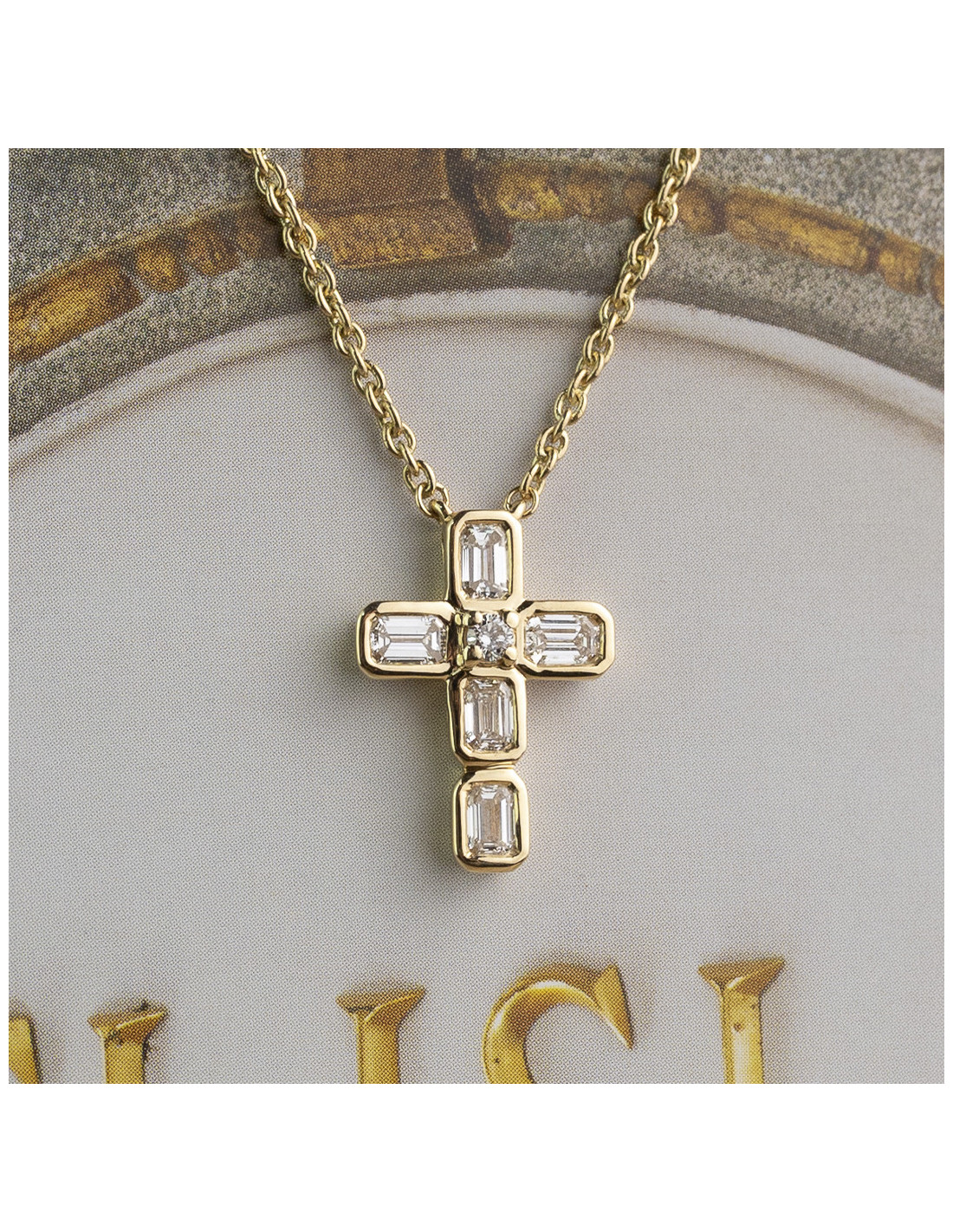 Collar "Leah" de oro amarillo de 18 Kt. con cruz de diamantes talla esmeralda y talla brillante. Elegancia y fe en cada brillo.