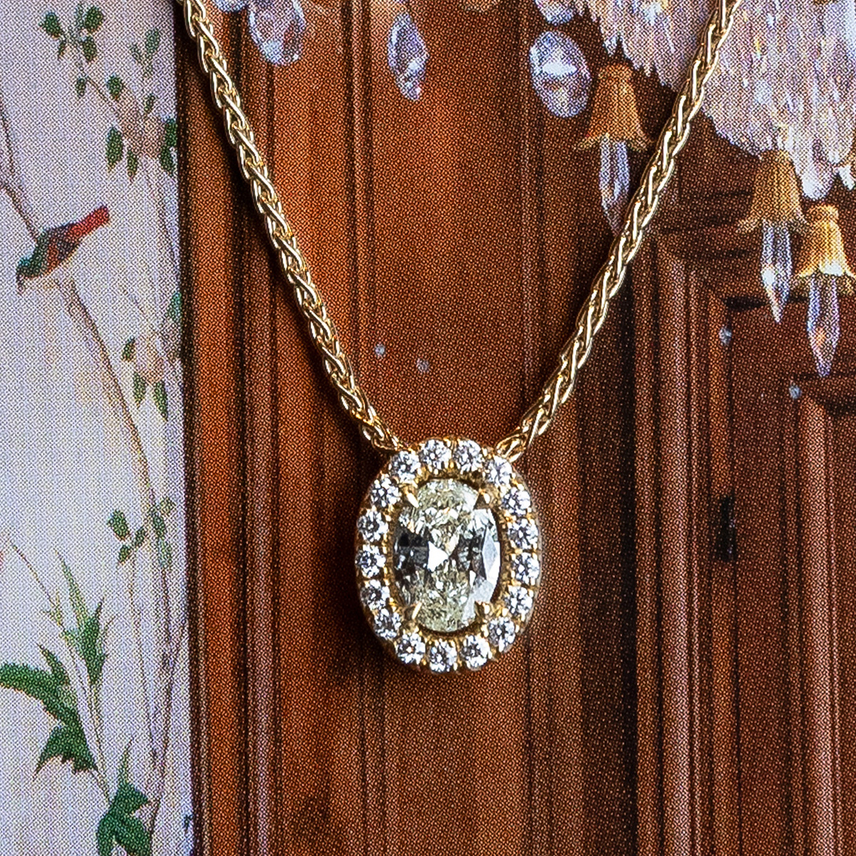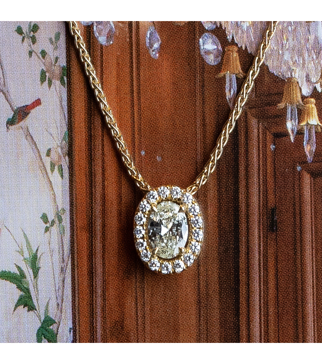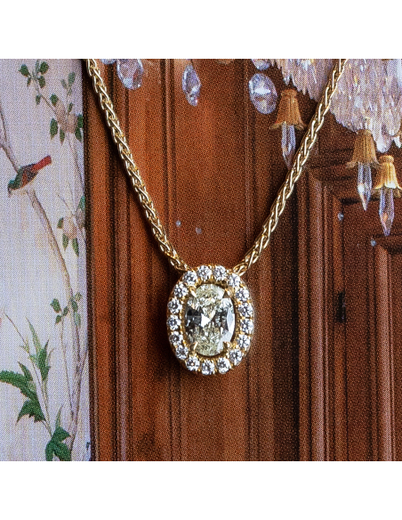 Collar "Concha" de oro amarillo de 18Kt. con diamante talla oval y bisel de diamantes. Un diseño exclusivo que realzará cualquier look.