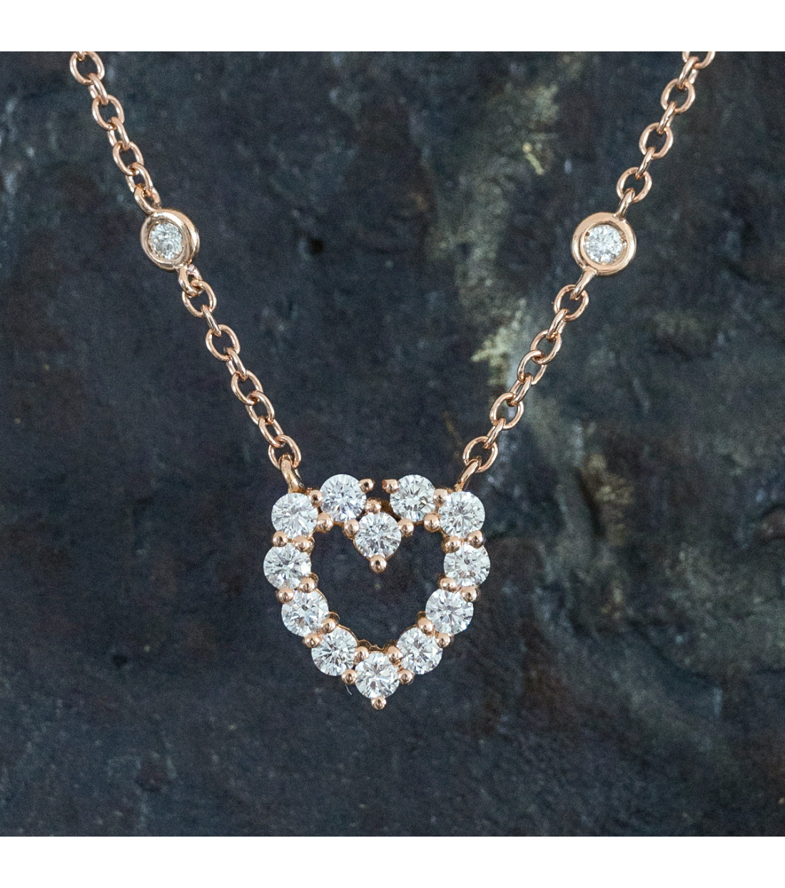Collar "Amor" de oro rosa compuesta por una cadena con chatones de diamantes talla brillante y un colgante corazón de diamantes talla brillante. Especial para deslumbrar a todos a tu alrededor.
