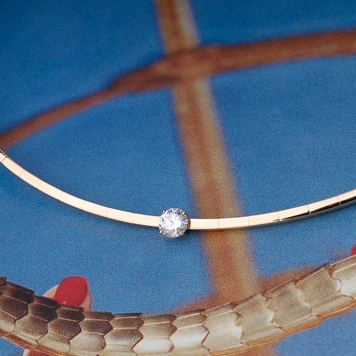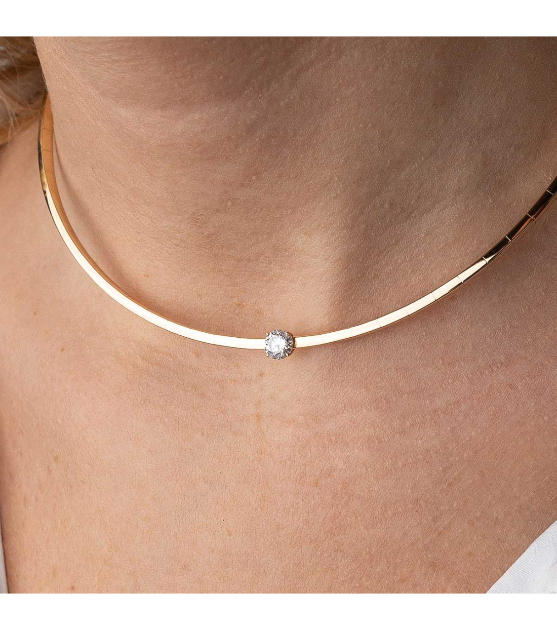Gargantilla semirrígida "Noemi" de oro rosa de 1ª Ley de 18Kt con diamante talla brillante 0,52Cts. (GIA). Diseño favorecedor y vanguardista ideal para realzar cualquier look. Luxe total.