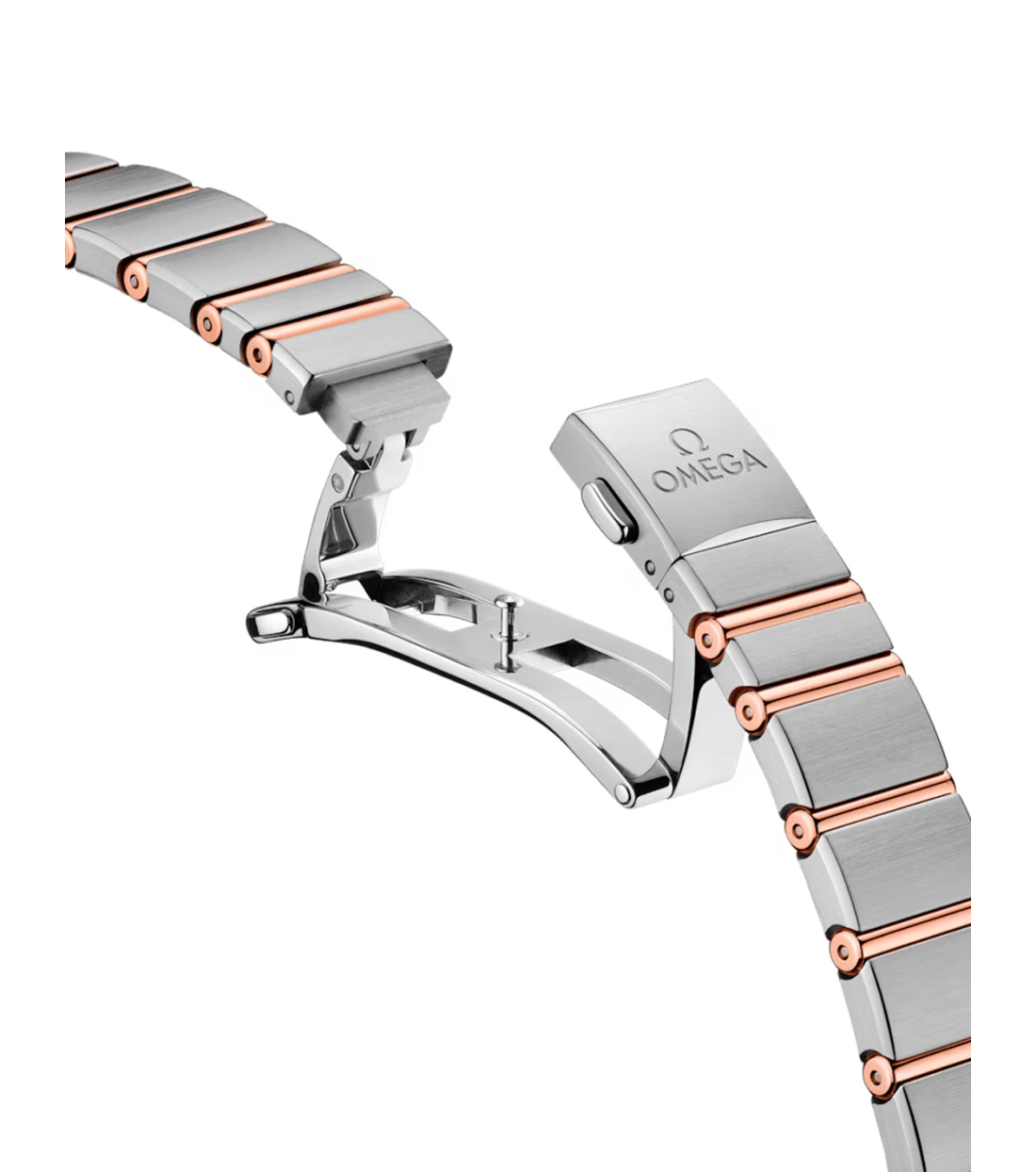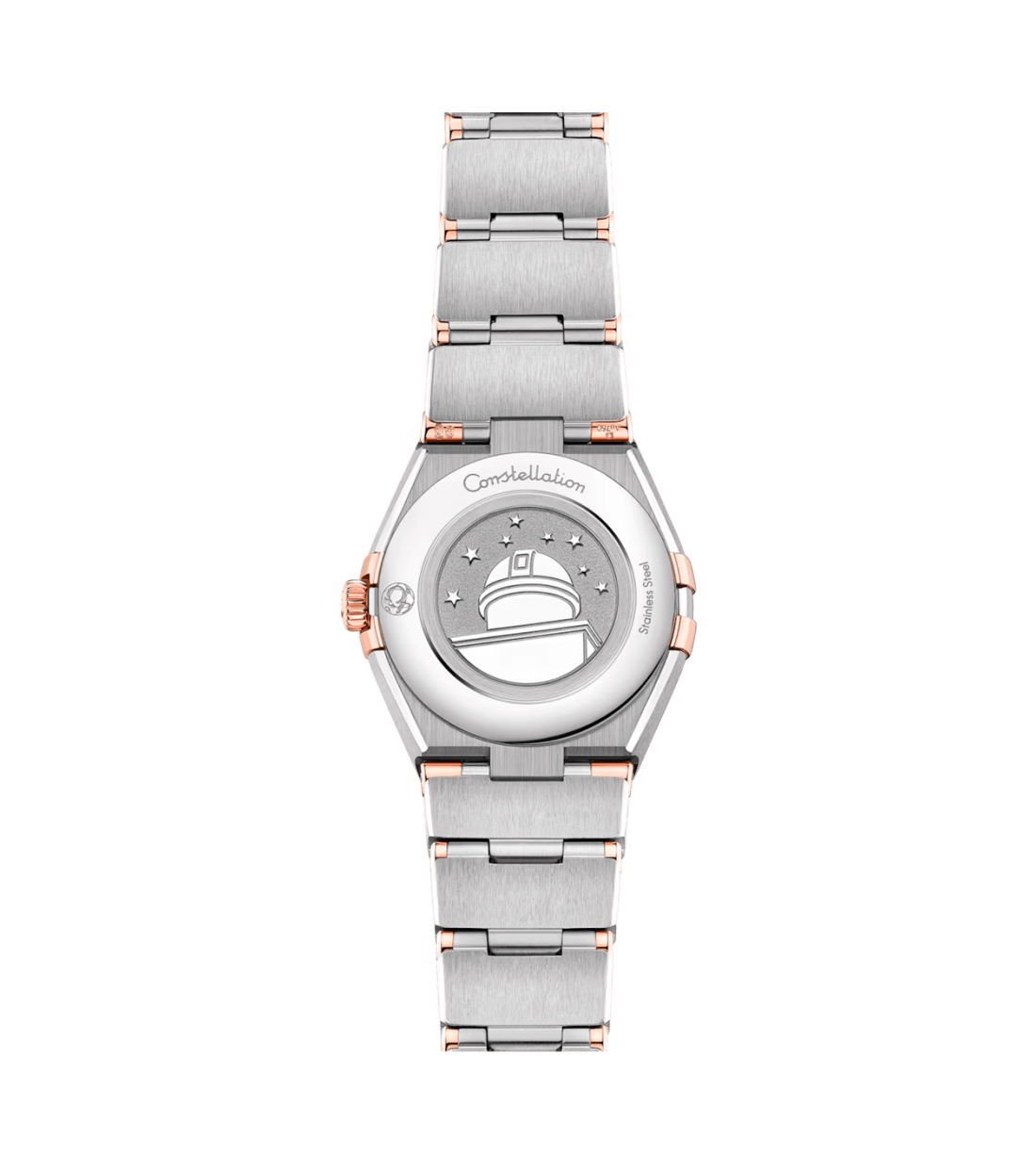 Este modelo de 25 mm en oro Sedna™ de 18 qt y acero noble tiene un bisel con números romanos grabados y una esfera de cristal de venturina azul con diamantes como índices horarios. Las agujas, el logotipo OMEGA, la estrella Constellation y los engastes de los diamantes son también de oro Sedna™ de 18 qt.