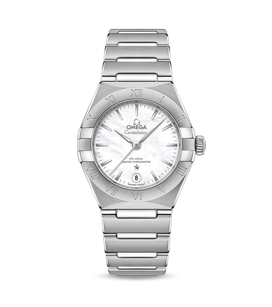 Este reloj Omega para mujer de 29 mm en acero noble luce un bisel con números romanos grabados, esfera de nácar perlado y una ventana de fecha situada a las 6 h. Las agujas, el logotipo OMEGA, la estrella Constellation y los índices son de oro blanco de 18 qt.