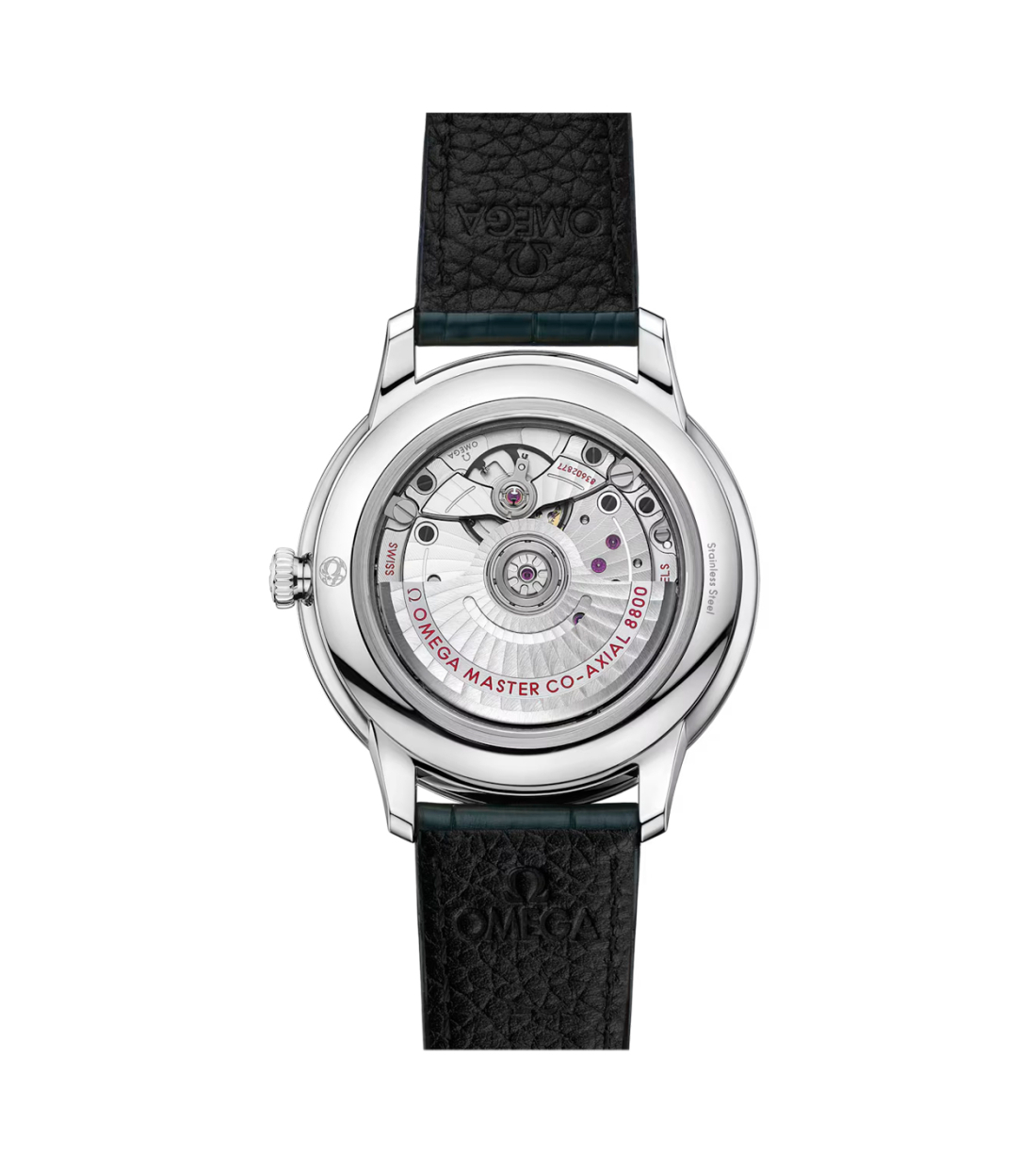 Este reloj certificado Master Chronometer se presenta con una pulsera de piel color verde pino y está equipado con el calibre OMEGA Master Co-Axial 8800, visible a través del fondo de cristal de zafiro resistente al rayado.