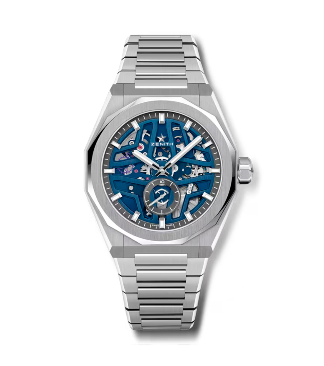 El DEFY Skyline Skeleton cuenta con una caja octogonal esqueletizada de acero de 41 mm con bisel facetado y presenta una esfera abierta azul que reinterpreta la emblemática estrella de cuatro puntas de ZENITH. Está equipado con el movimiento esqueleto de Manufactura automático de 3620 SK alta frecuencia El Primero 3620 con el primer indicador de las décimas de segundo. Cuenta con un brazalete de acero intercambiable y correa de caucho con motivo azul. Para aprovechar al máximo el principio de componentes intercambiables del reloj, se incluye una segunda correa.