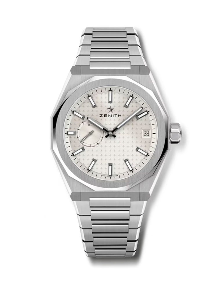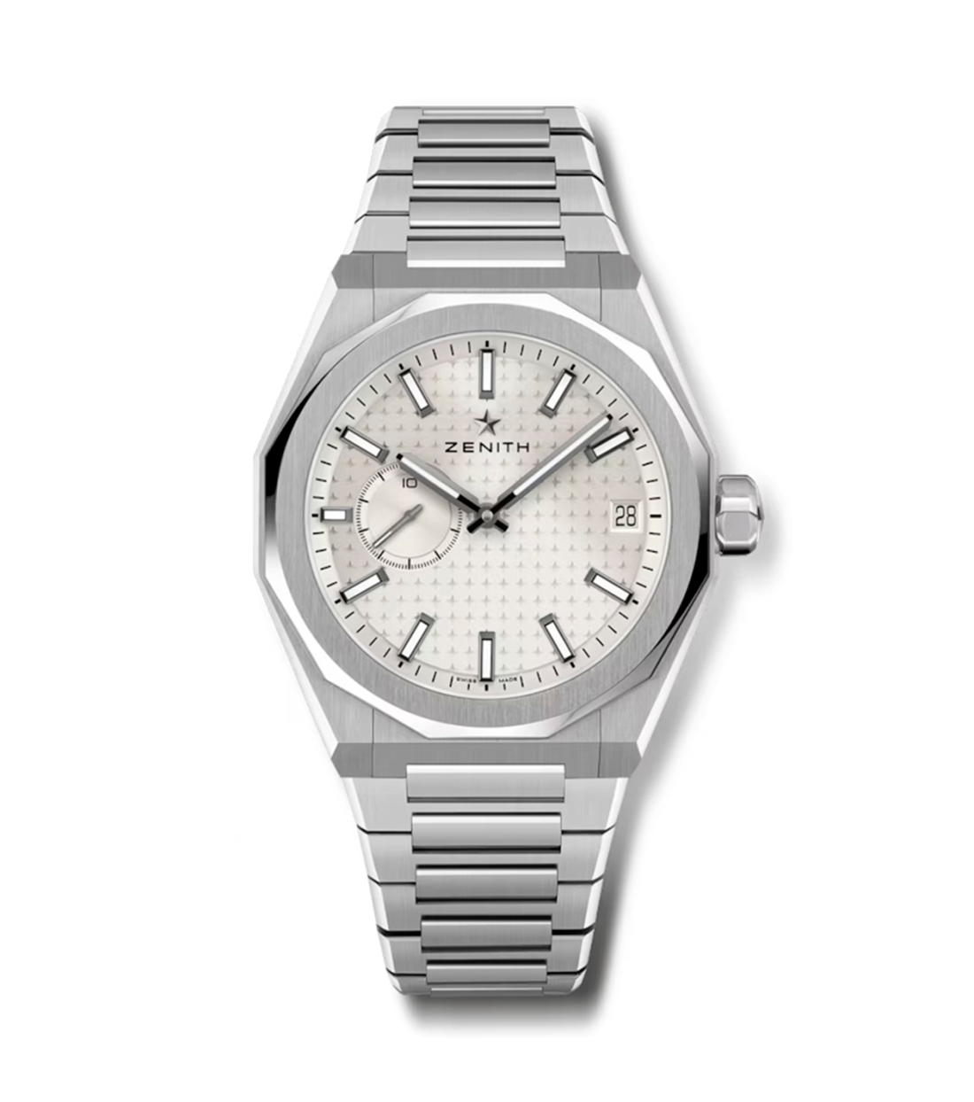 El DEFY Skyline cuenta con una caja octogonal de acero de 41 mm con bisel facetado y presenta una esfera rayos de sol plateada que reinterpreta la emblemática estrella de cuatro puntas de ZENITH. Está equipado con el movimiento de manufactura automático de alta frecuencia El Primero 3620 con el primer indicador de las décimas de segundo. Cuenta con un brazalete de acero intercambiable y correa de caucho con motivo verde caqui.