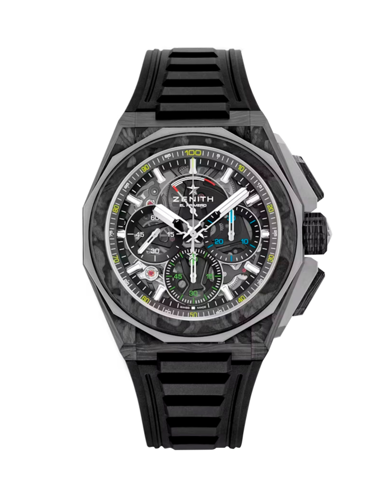 El cronógrafo automático de alta frecuencia DEFY Extreme Carbon con indicación de las centésimas de segundo está fabricado en fibra de carbono y titanio ligeros pero resistentes. La esfera de zafiro tintado se inspira en los colores de los ralis eléctricos EXTREME E y revela el movimiento automático el Primero 21 con dos escapes que laten a 50 Hz y a 5 Hz. El reloj DEFY Extreme se presenta con una correa de caucho negro, además de una correa de caucho rojo y una correa de Velcro® negro.