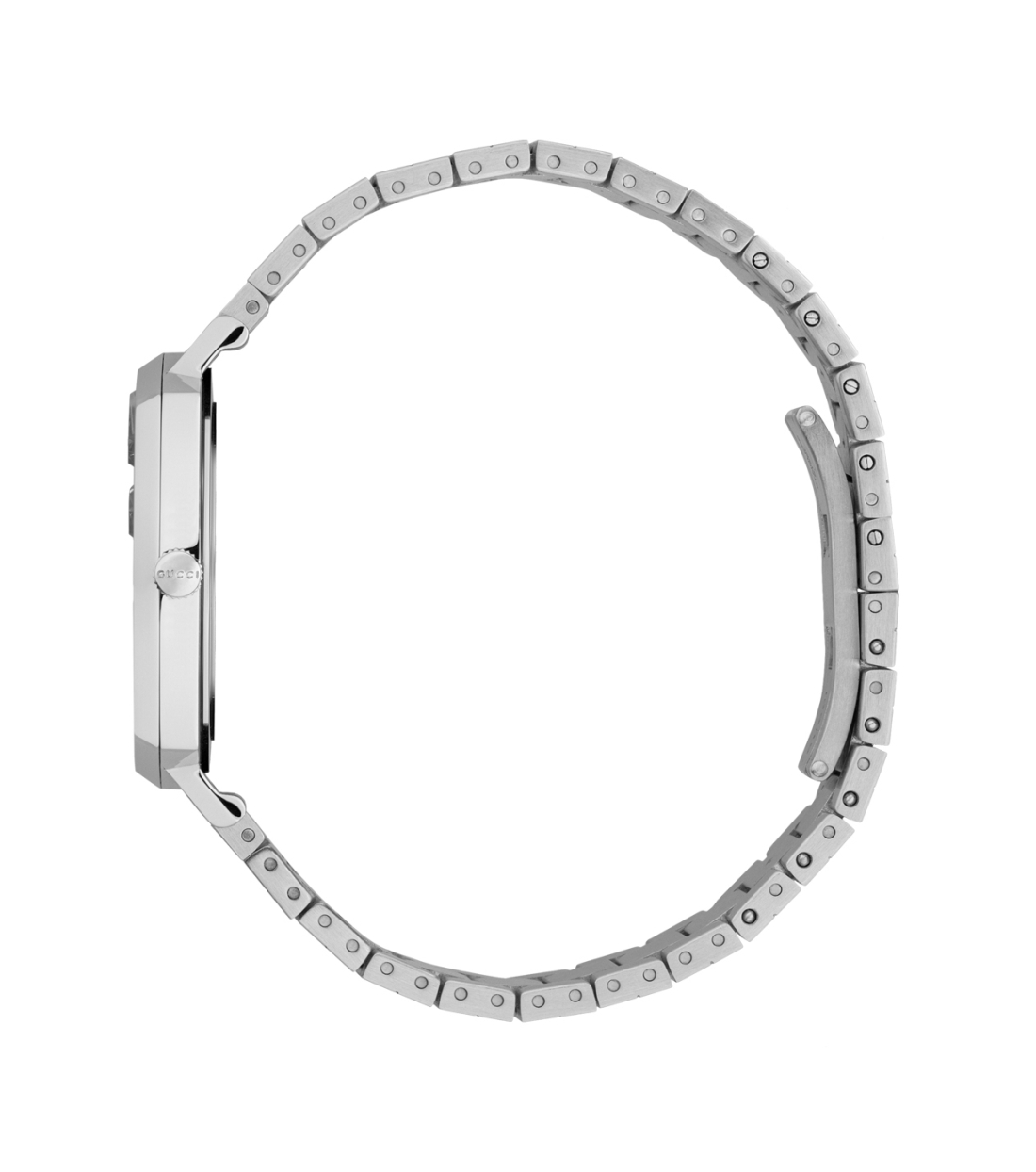 El reloj Grip se presenta en acero inoxidable con el motivo GG grabado en la correa y la esfera. Incluye tres subesferas que muestran la hora, los minutos y la fecha.