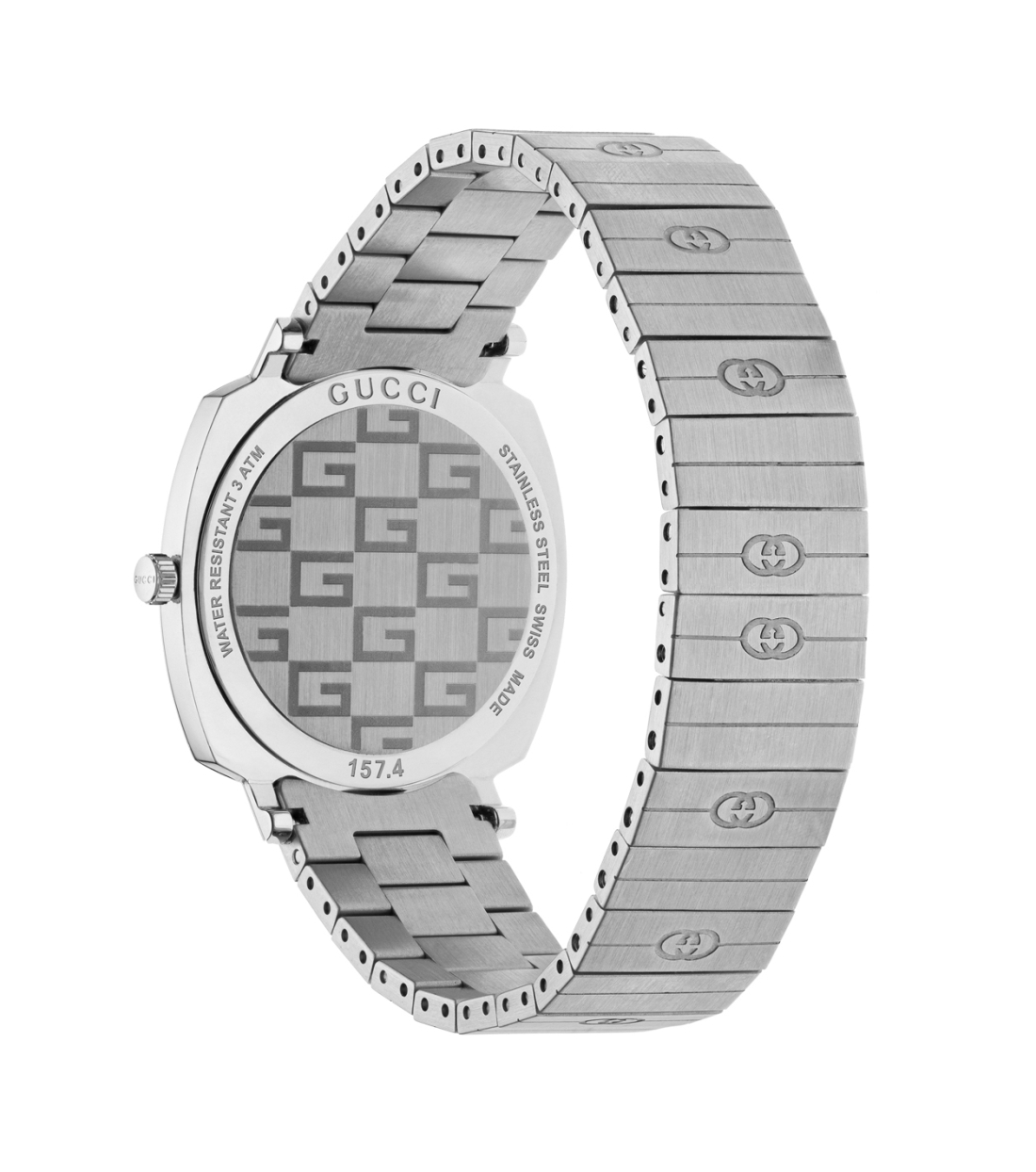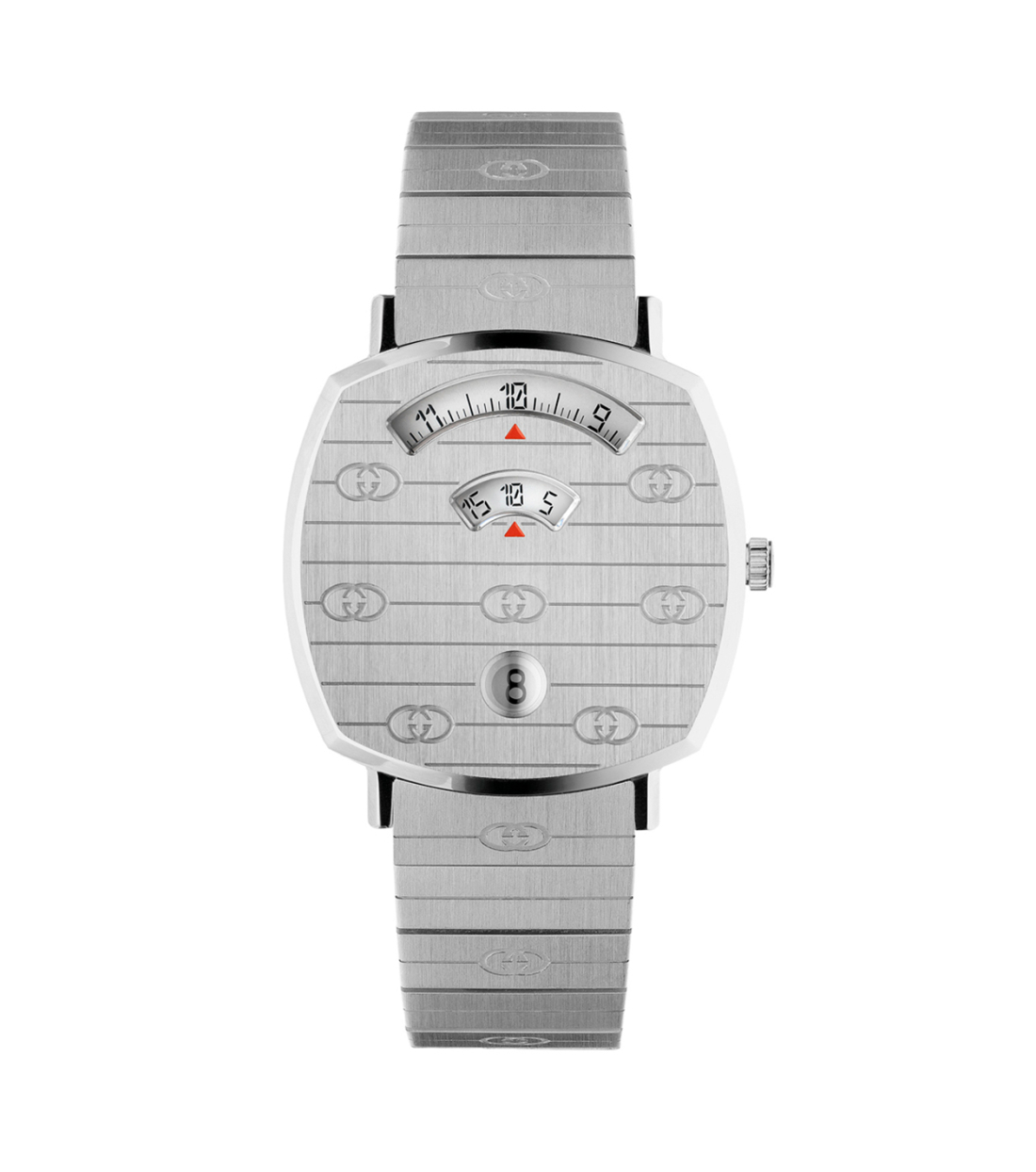 El reloj Grip se presenta en acero inoxidable con el motivo GG grabado en la correa y la esfera. Incluye tres subesferas que muestran la hora, los minutos y la fecha.