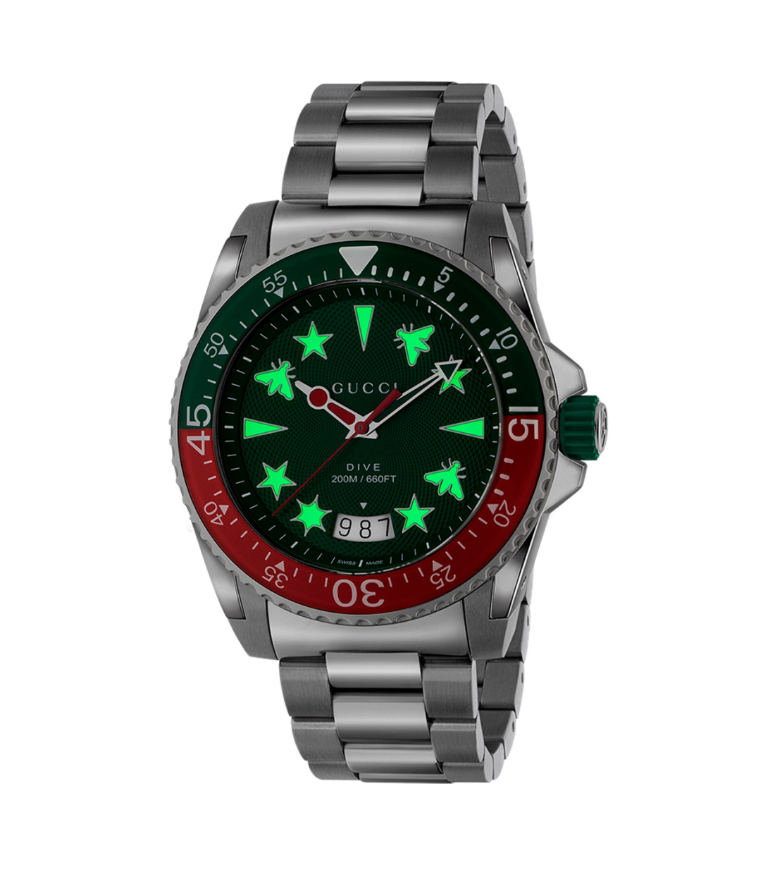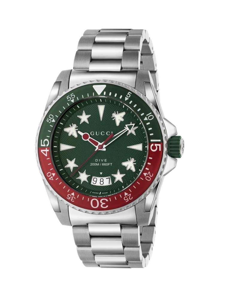Con un diseño inspirado en los relojes sumergibles, el Gucci Dive ofrece un look contemporáneo que combina una correa de acero, una esfera verde y una corona de goma verde.
