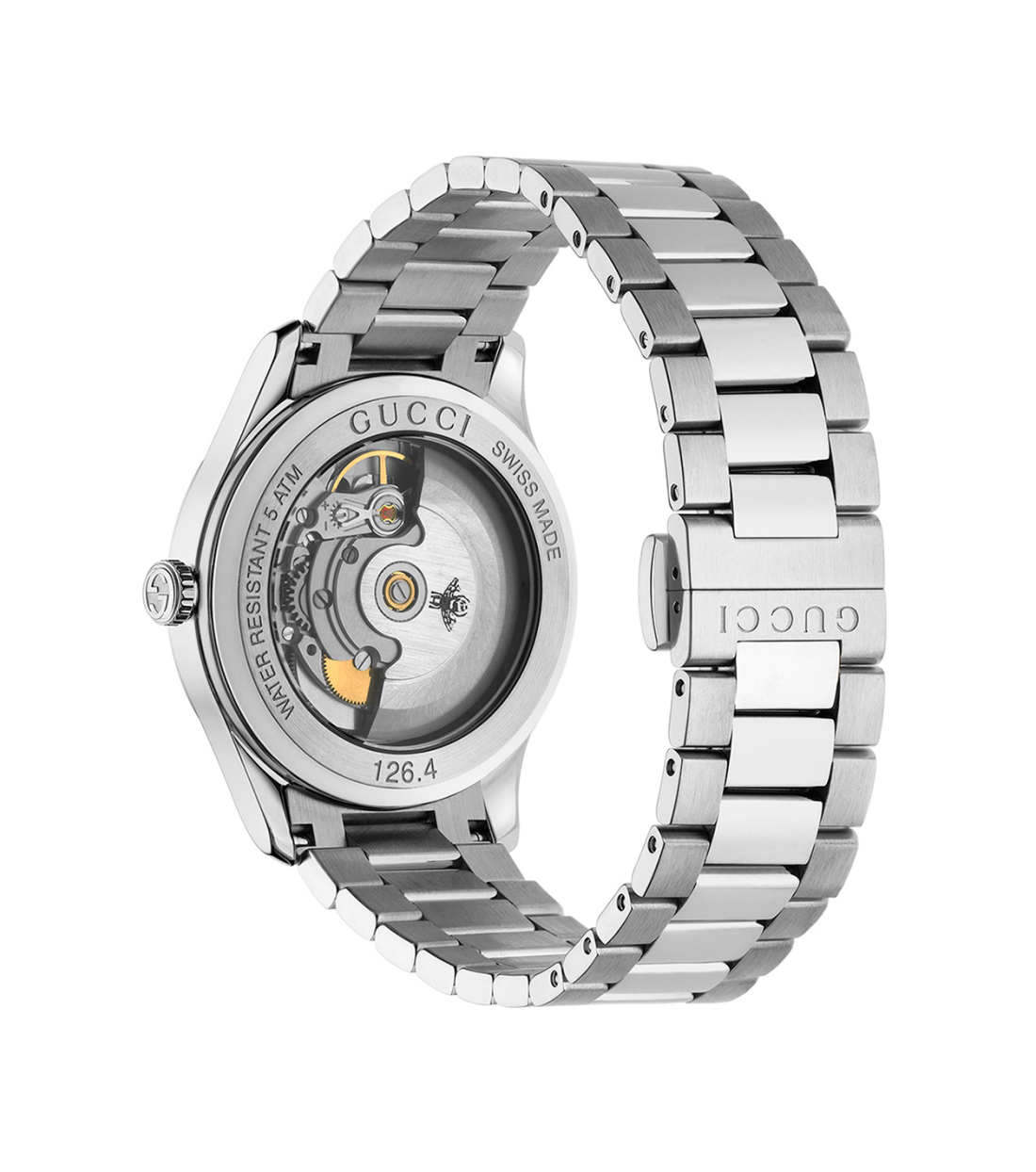 Este reloj automático, que forma parte de la línea G-Timeless, tiene una esfera negra de ónix adornada con índices plateados en forma de abeja Gucci, un código emblemático de la Firma.
