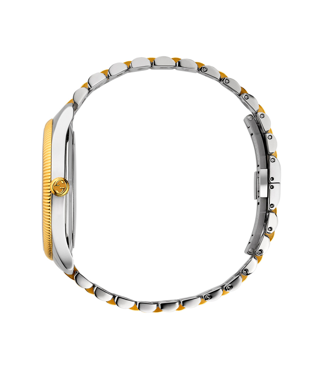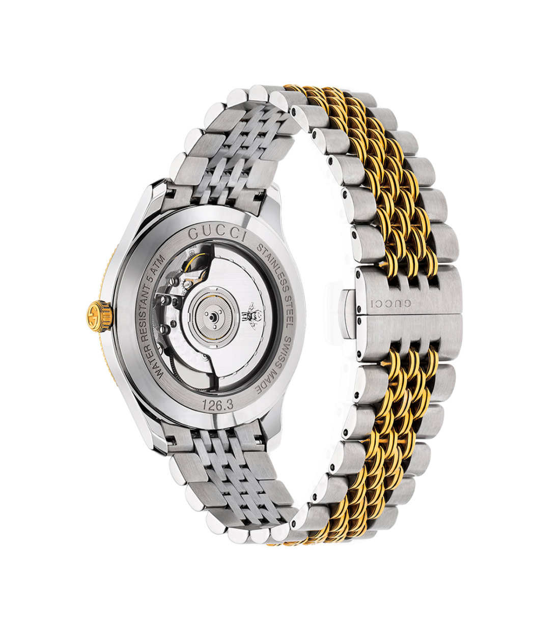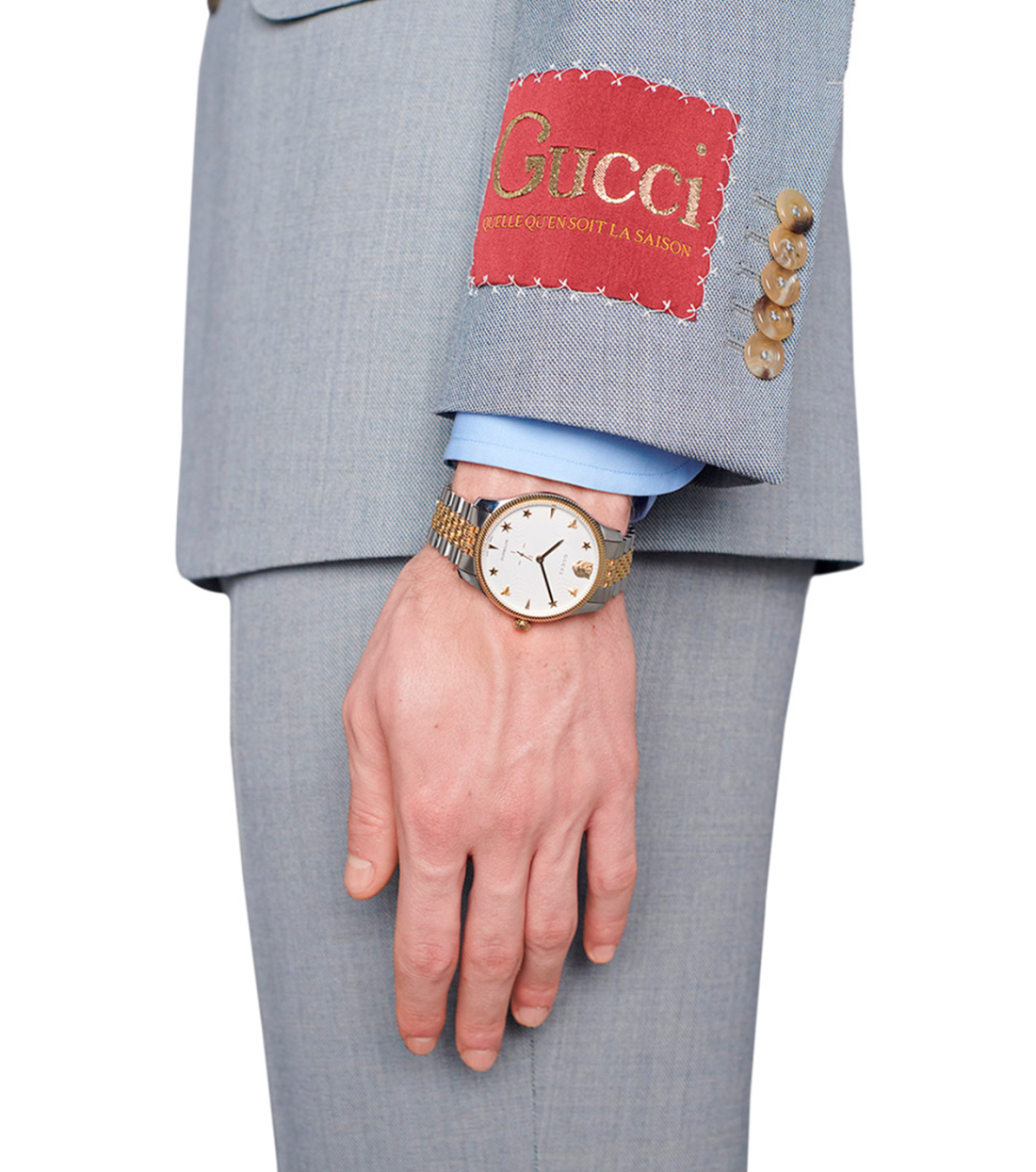 Como parte de la colección G-Timeless, este reloj clásico de acero y PVD en oro amarillo se ha diseñado con gusto tradicional, en yuxtaposición con códigos inspirados en la narrativa de Gucci. La esfera presenta varios motivos de la Firma, como la abeja, la estrella y la cabeza felina.