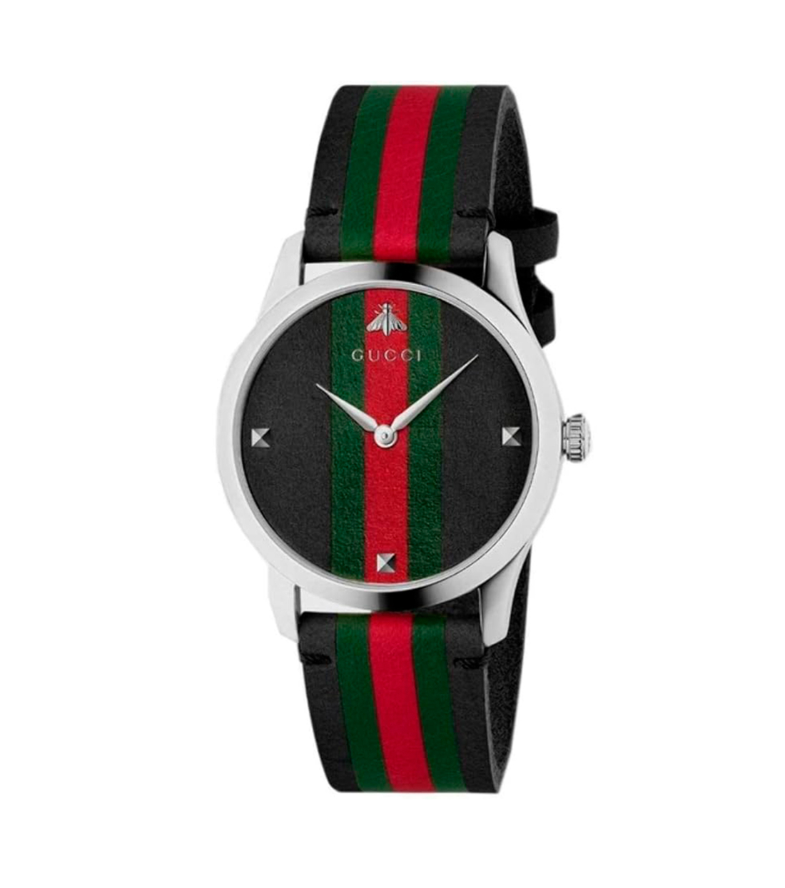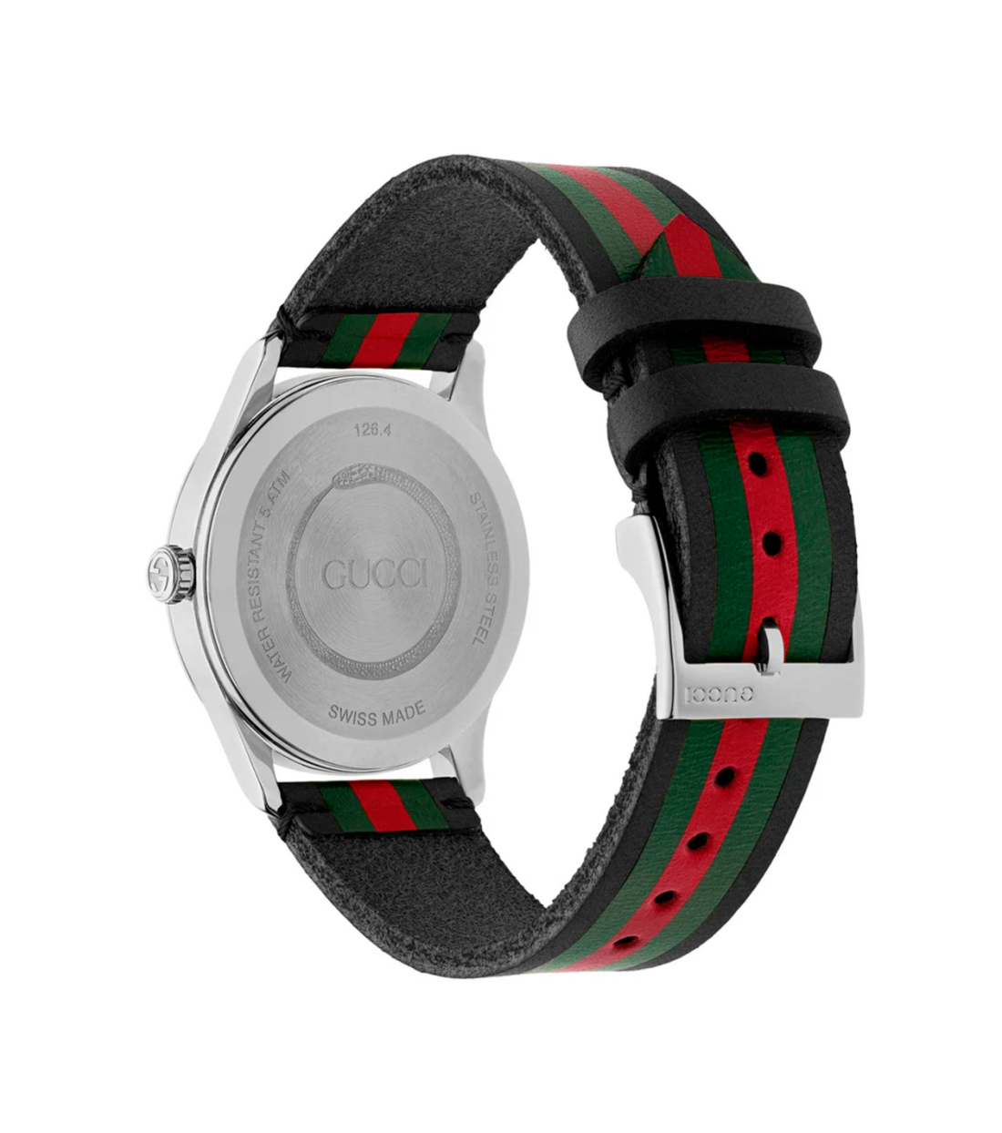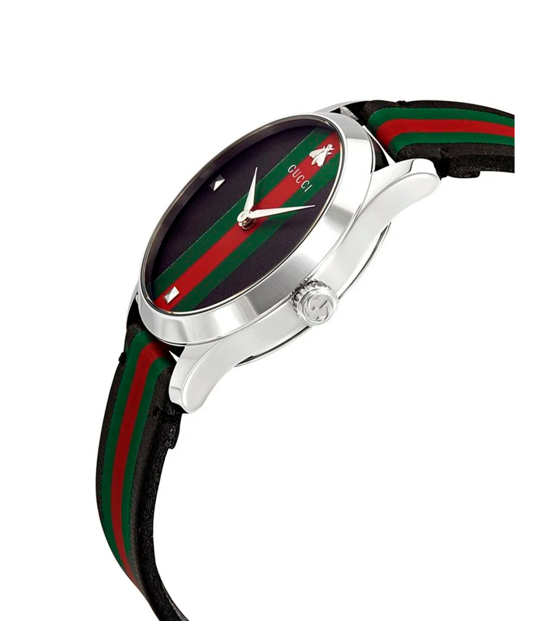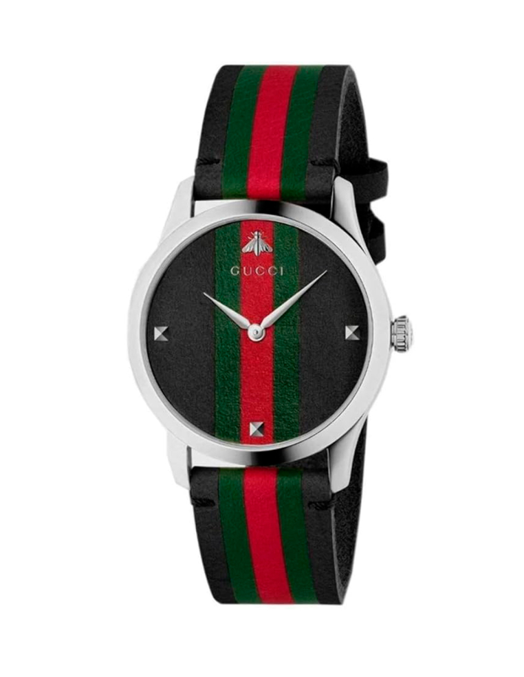 Reloj Gucci G-Timeless para hombre. Es un reloj analógico dos agujas con correa de piel multicolor y cierre de hebilla. La caja de este reloj en acero inoxidable. La resistencia al agua es de 50 metros (5atm). Funciona con movimiento de cuarzo. El cristal de la esfera es Zafiro irrayable y con tratamiento antireflectante en el interior combina la esfera color negro con estampado multicolor rojo-verde-rojo y agujas en color plata. El diámetro de la esfera es de 38 milímetros.