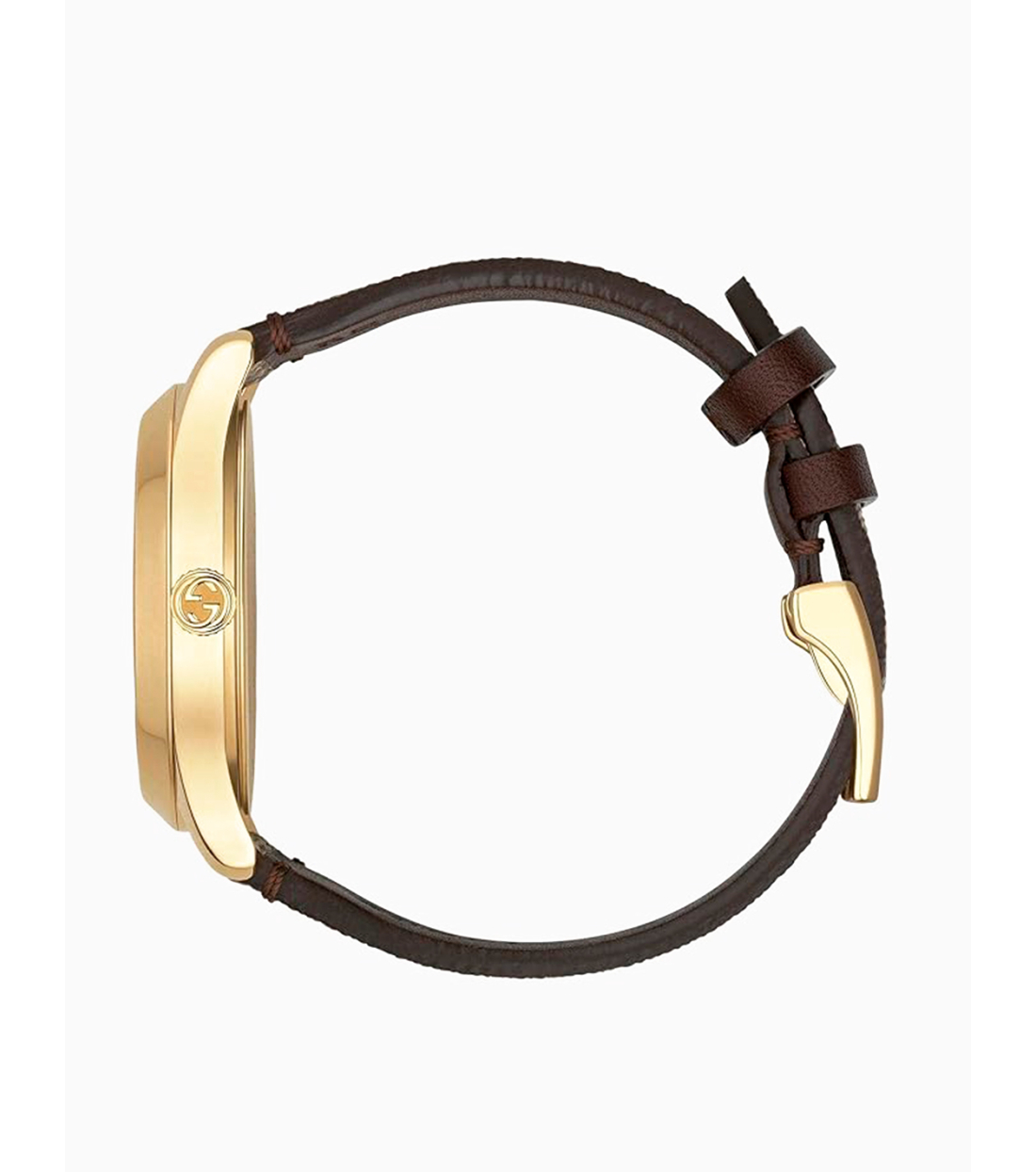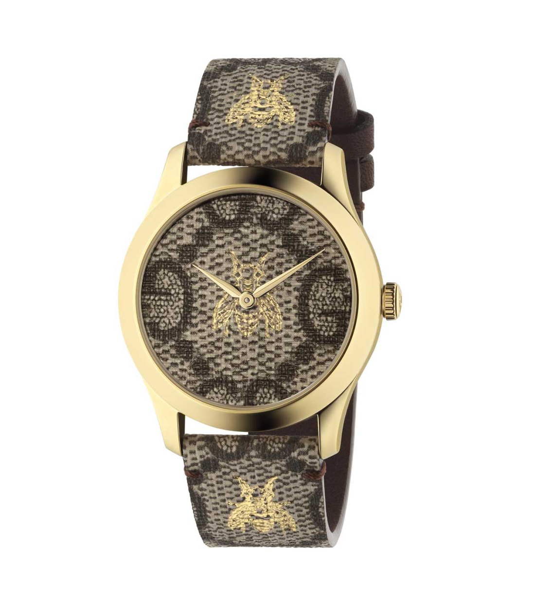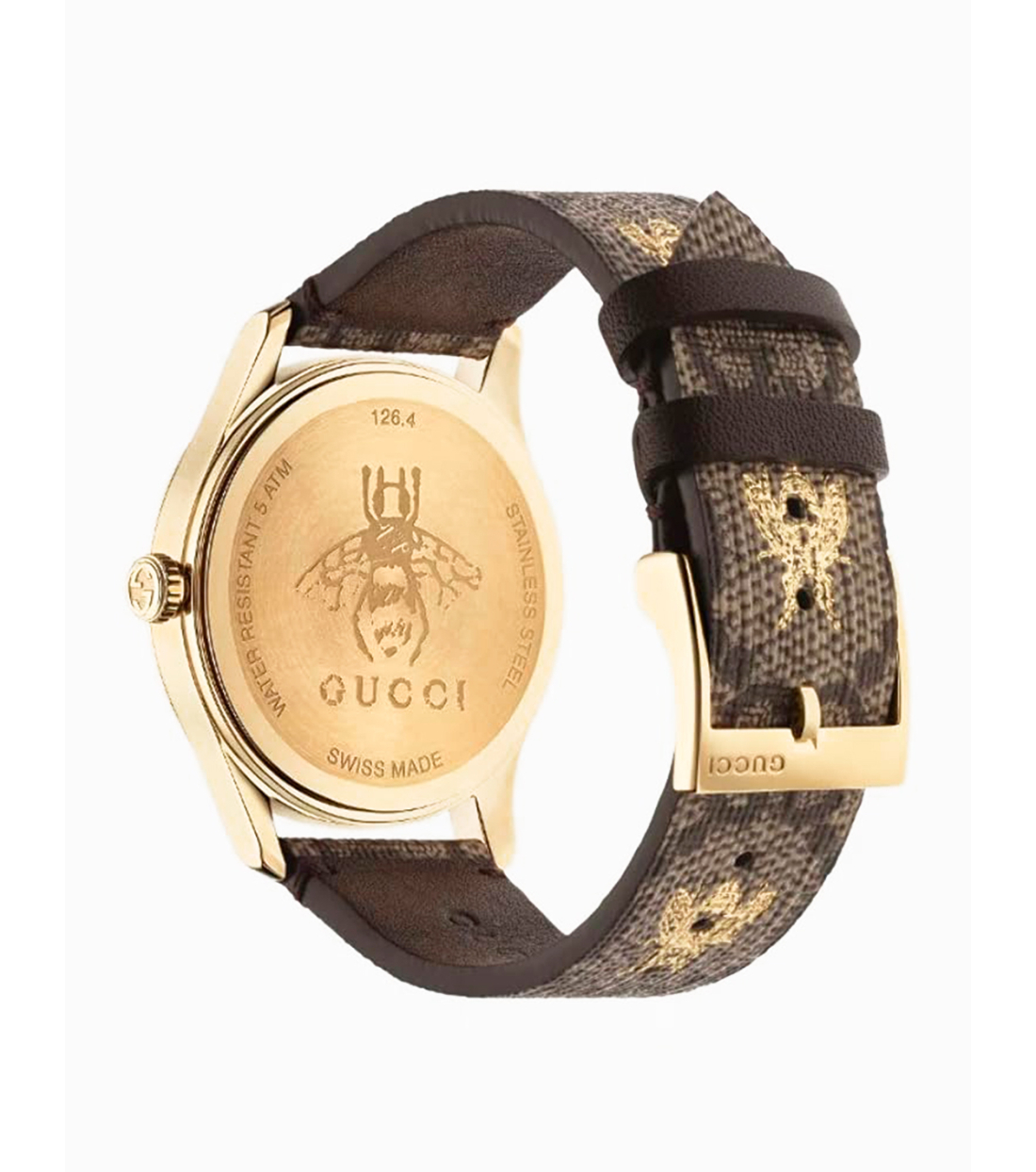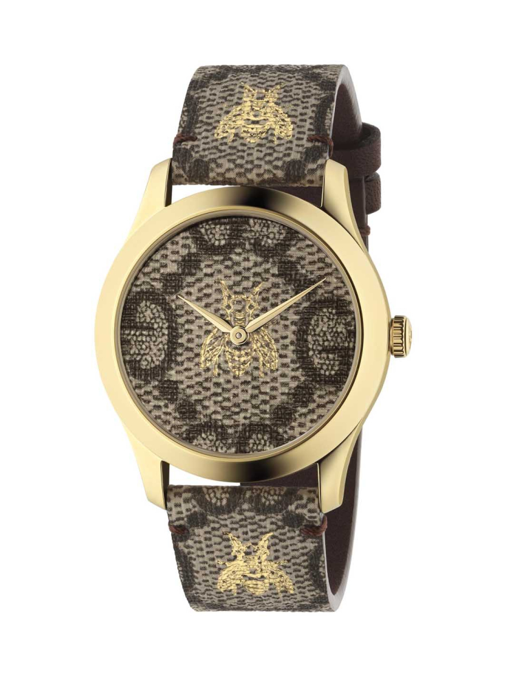 Reloj Gucci G-Timeless Md unisex. Es un reloj analógico dos agujas con correa de piel multicolor y cierre de hebilla. La caja de este reloj en acero inoxidable en color dorado. La resistencia al agua es de 50 metros (5atm). Funciona con movimiento de cuarzo. El cristal de la esfera es Zafiro irrayable y con tratamiento antireflectante en el interior combina el logo de la marca con estampado multicolor y agujas en color dorado. El diámetro de la esfera es de 38 milímetros.