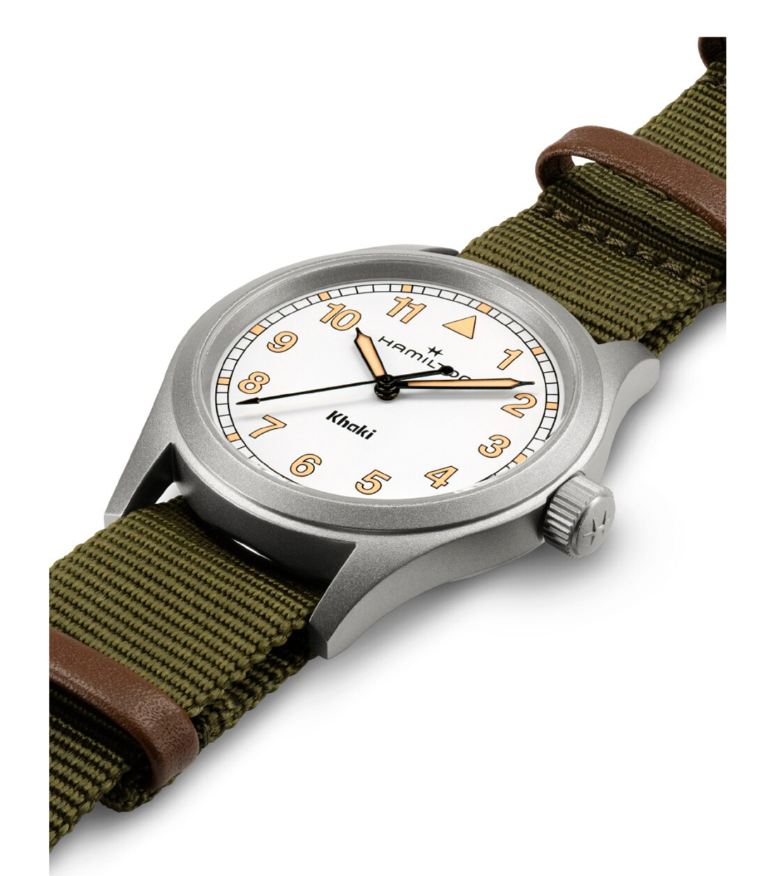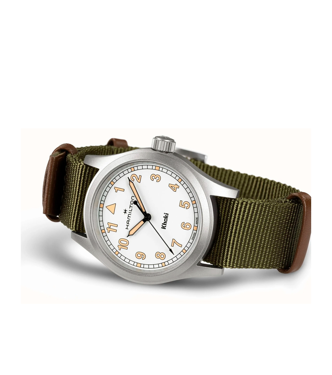 El Khaki Field Quartz expresa el regreso al legado militar de Hamilton a través de la sencillez en el diseño. La esfera presenta una tipografía clara con números arábigos más rectos y un minutero de vía ferroviaria. La paleta de colores es discreta, con su elegante esfera blanca realzada con índices con Super-LumiNova® color radio envejecido. El reloj incluye una correa NATO de tejido verde y pasadores de piel color marrón, perfecta para tu próxima aventura en cualquier terreno.