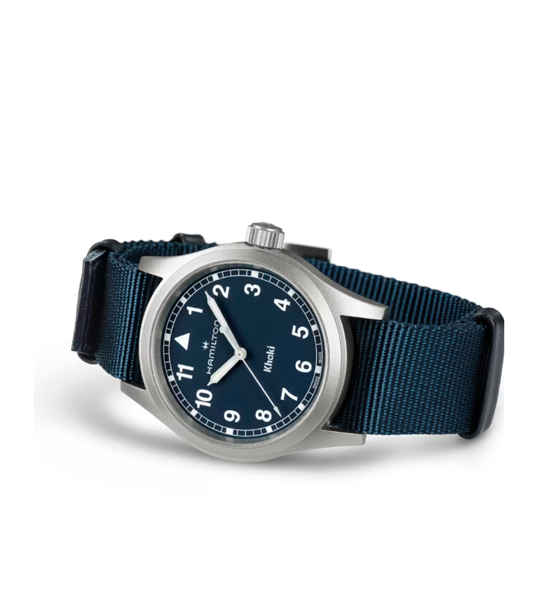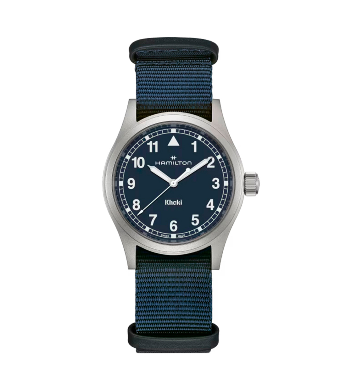 El Reloj Khaki Field Quartz expresa el regreso al legado militar de Hamilton a través de la sencillez en el diseño. La esfera presenta una tipografía clara con números arábigos más rectos y un minutero de vía ferroviaria. La paleta de colores es discreta, con su elegante esfera azul realzada con índices con Super-LumiNova® blanco. El reloj incluye una correa NATO de tejido azul y pasadores de piel color azul, perfecta para tu próxima aventura en cualquier terreno.