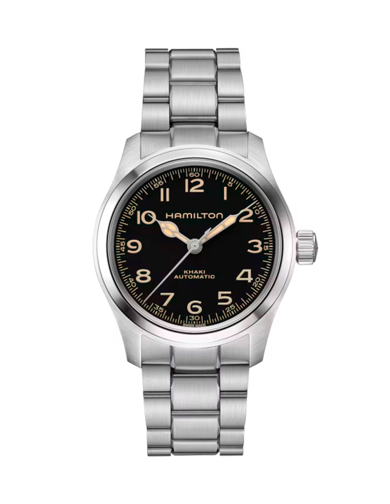 El reloj Hamilton Murph original, un icono del cine, se reinventa ahora con un toque moderno. Los números del Khaki Field Murph, dispuestos sobre una esfera negra, están ligeramente abombados y ofrecen una mayor legibilidad, mientras que las agujas tipo catedral aportan una estética vintage al reloj. La versión original de 38 mm, una pieza para los entusiastas de Hamilton y Hollywood, ya está disponible con un brazalete de metal cepillado de tres hileras.