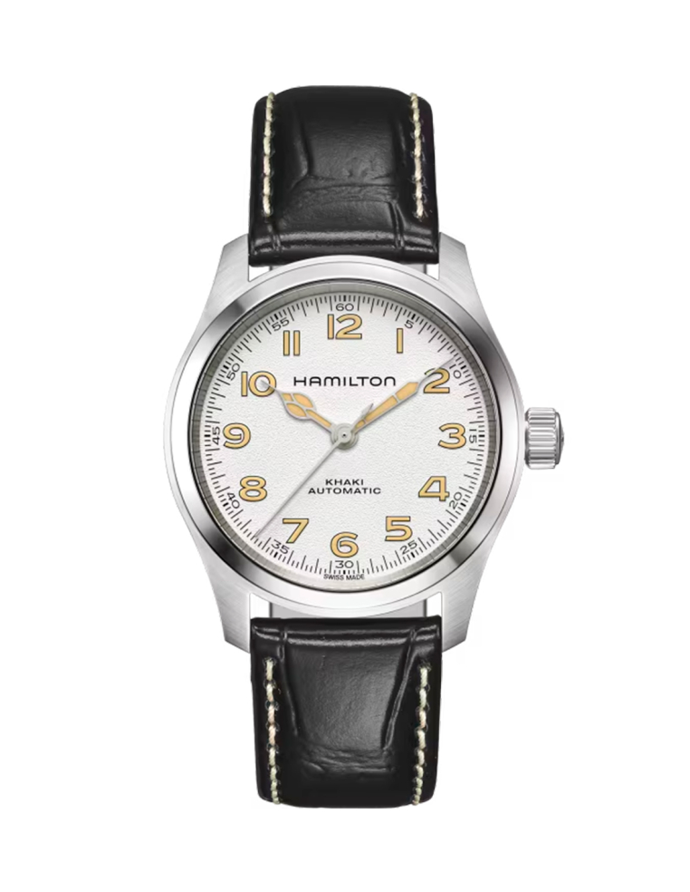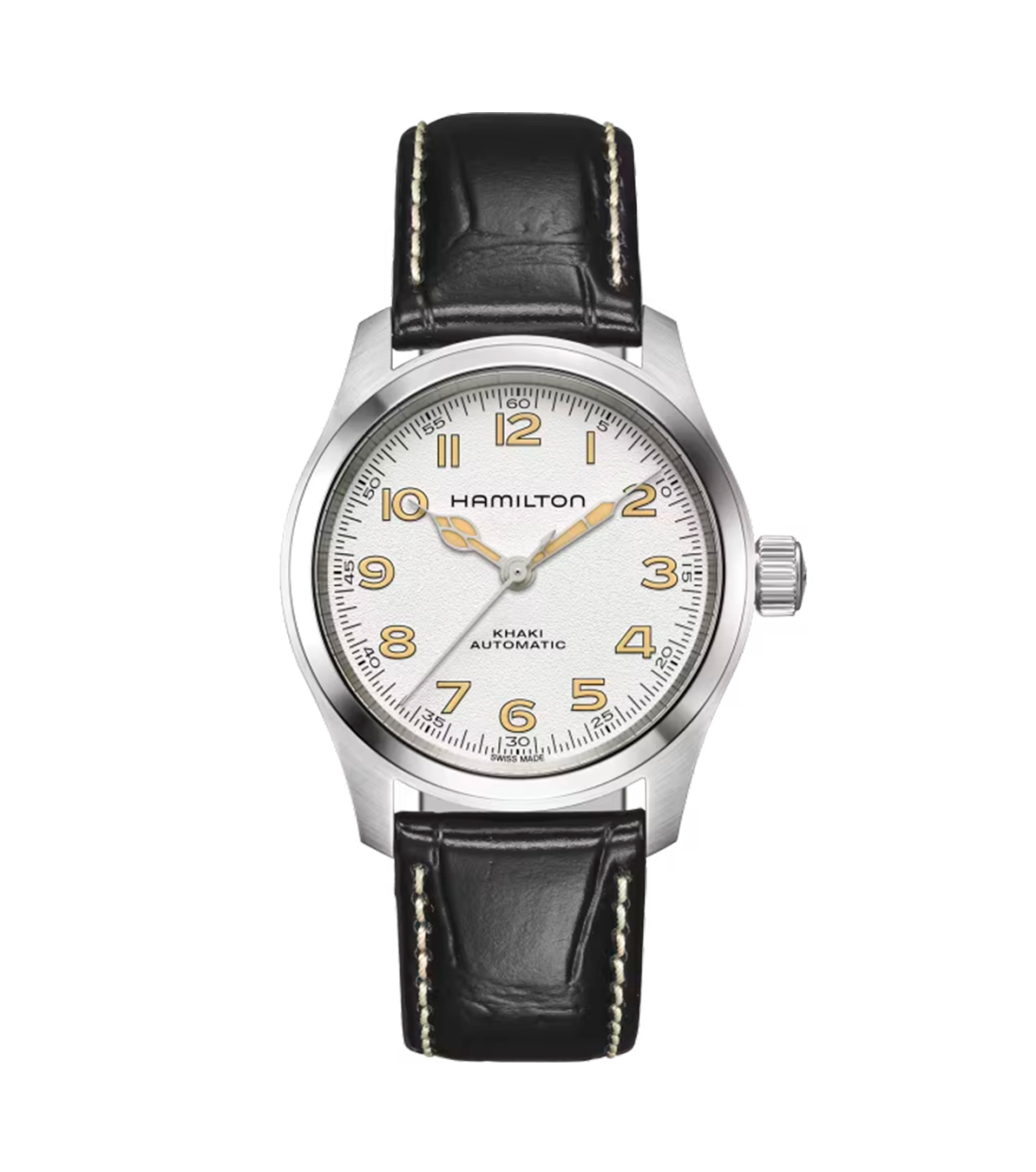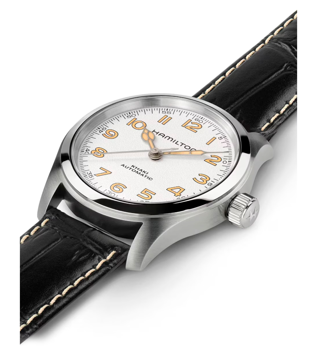 El Reloj Hamilton Murph original, un icono del cine, se reinventa ahora con un toque moderno. Una nueva esfera en blanco envejecido con acabado granulado realza las agujas tipo catedral, que aportan una estética vintage al reloj. La nueva esfera blanca, una pieza para los entusiastas de Hamilton y Hollywood, ya está disponible con una correa de piel negra.