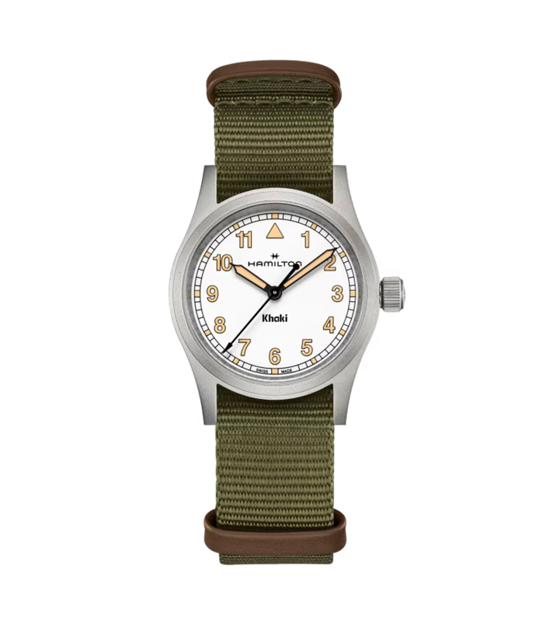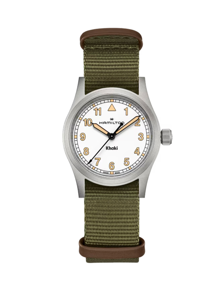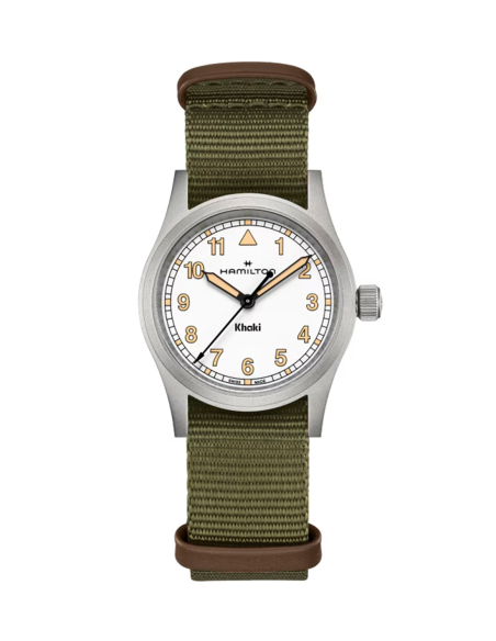 El Khaki Field Quartz expresa el regreso al legado militar de Hamilton a través de la sencillez en el diseño. La esfera presenta una tipografía clara con números arábigos más rectos y un minutero de vía ferroviaria. La paleta de colores es discreta, con su elegante esfera blanca realzada con índices con Super-LumiNova® color radio envejecido. El reloj incluye una correa NATO de tejido verde y pasadores de piel color marrón, perfecta para tu próxima aventura en cualquier terreno.