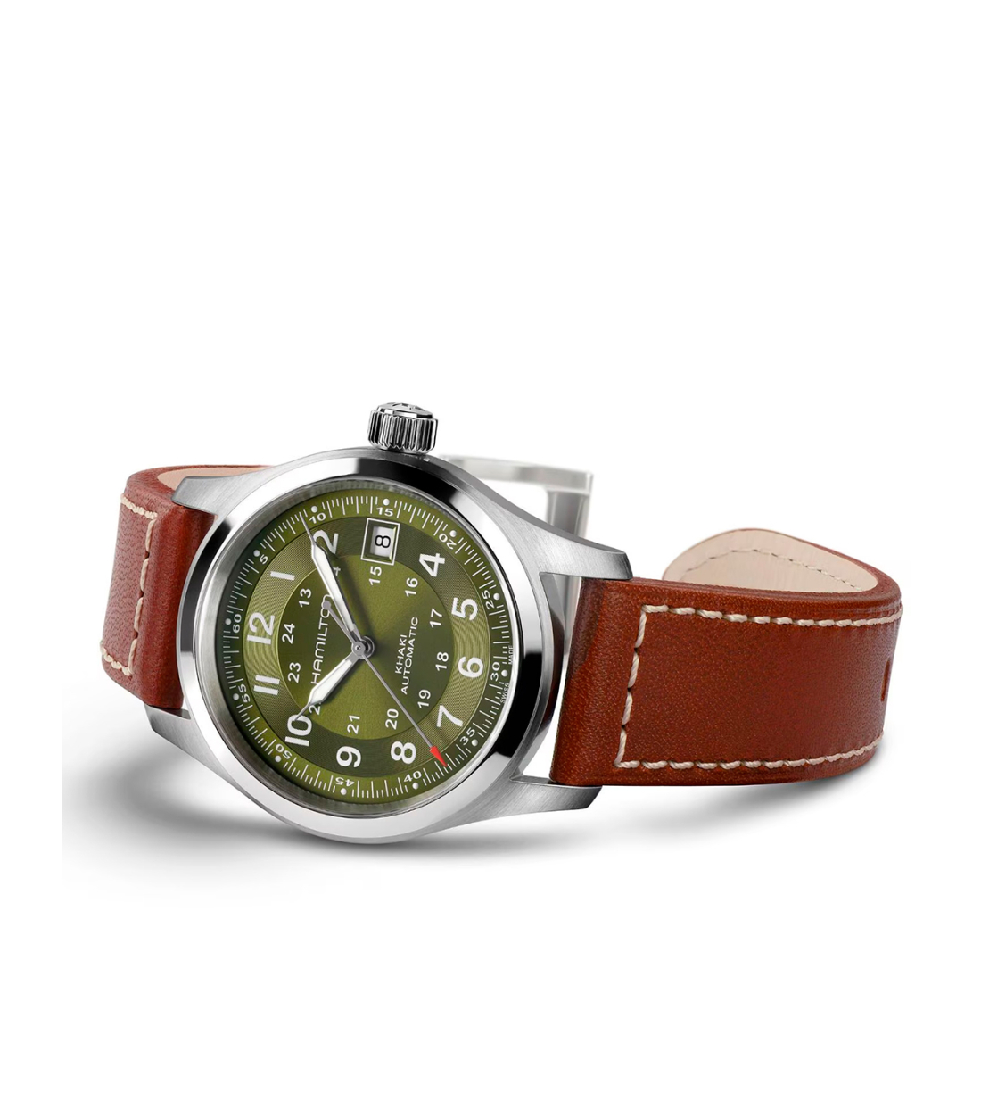 Inspirado en el reloj de soldado original, el Khaki Field Automatic combina el legado militar con el diseño contemporáneo, ofreciendo versatilidad para los pioneros modernos. Su esfera verde caqui con acabado de rayos de sol y un efecto en espiral en el anillo de las horas, refleja la luz a la vez que ofrece textura y profundidad. Diseñado para la acción y preparado para la aventura, su exclusivo calibre automático H-10 ofrece hasta 80 horas de reserva de marcha, asegurando un rendimiento fiable en cualquier situación. Descubre nuestra colección Khaki Field.