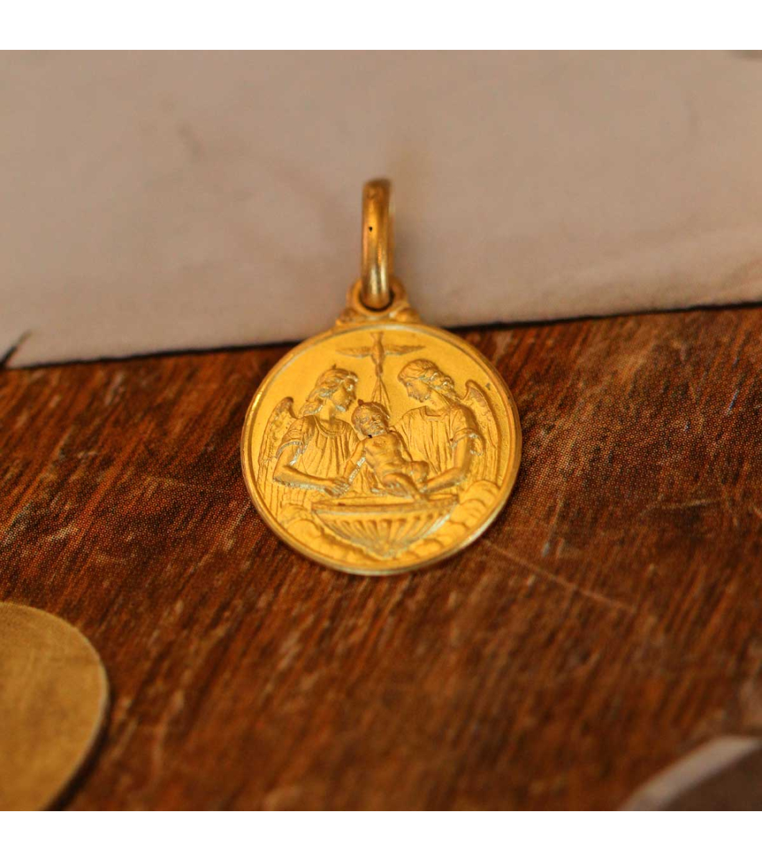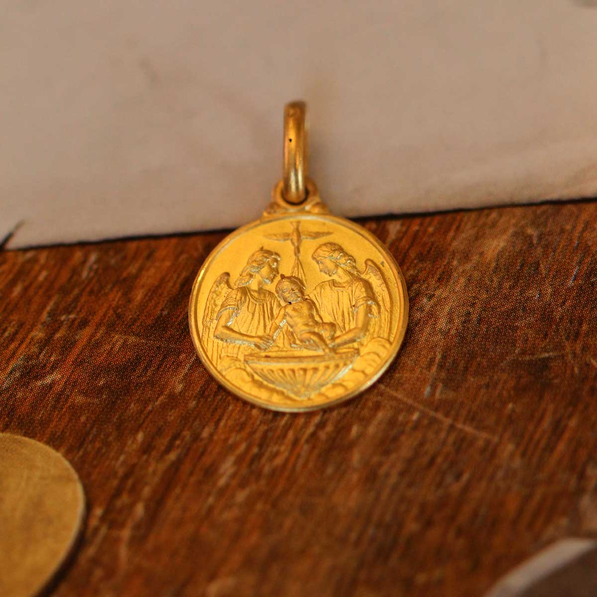 Medalla "El bautismo" de oro amarillo de primera ley de 18Kt. Diámetro de la medalla 14 mm, peso 2,4g. Fe, protección, recuerdo y compromiso espiritual y familiar.