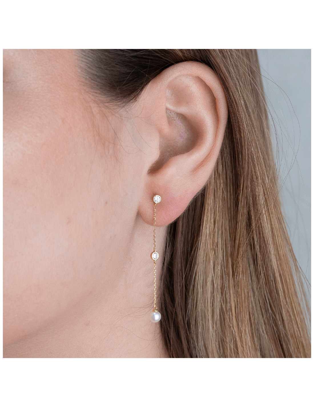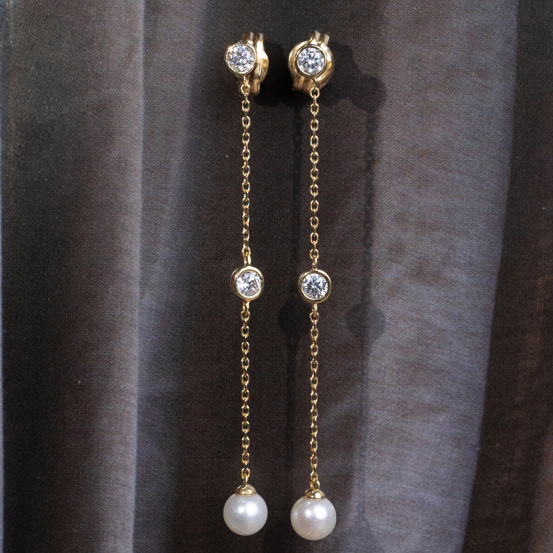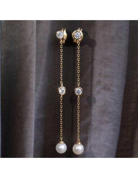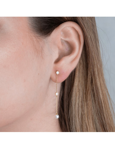 Pendientes "Xiaxia" compuesto por cadenas de oro amarillo de 18Kt con circonitas y perlas. Elegancia atemporal en movimiento.