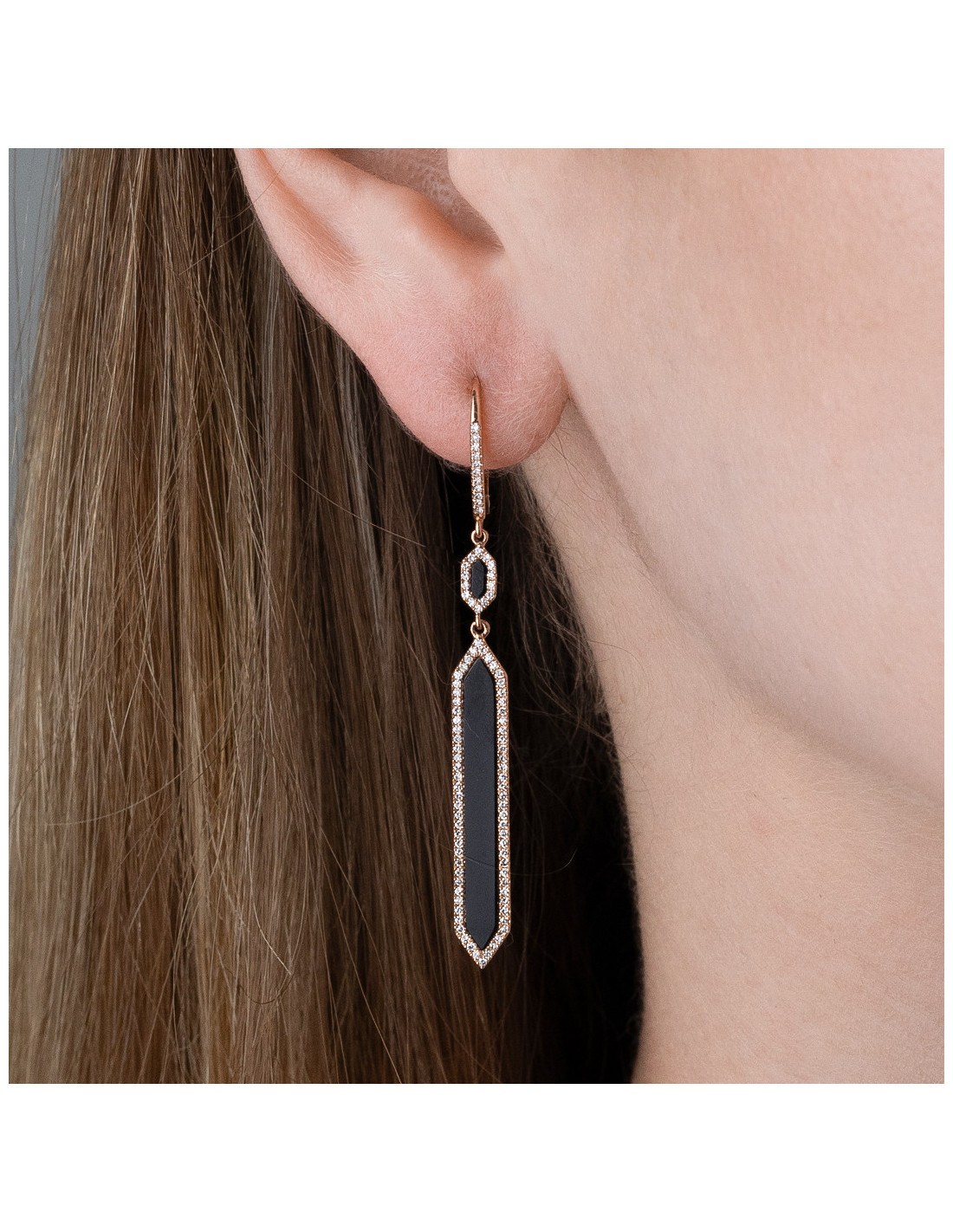 Pendientes "Eterna" de oro rosa con ónix y diamantes talla brillante. Un torrente de luz y sofisticación.