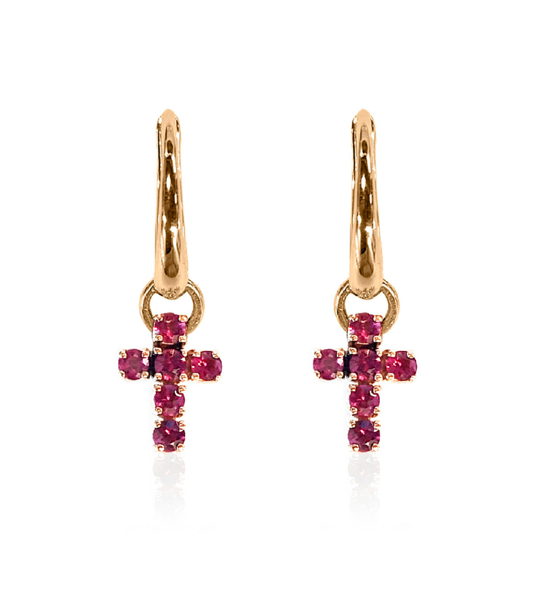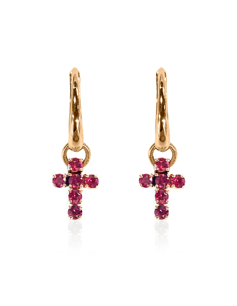 Pendientes "Alejandra" cruz de oro rosa con rubíes talla brillante (0,66 cts). Cierre ballesta. Perfectos para cualquier ocasión.