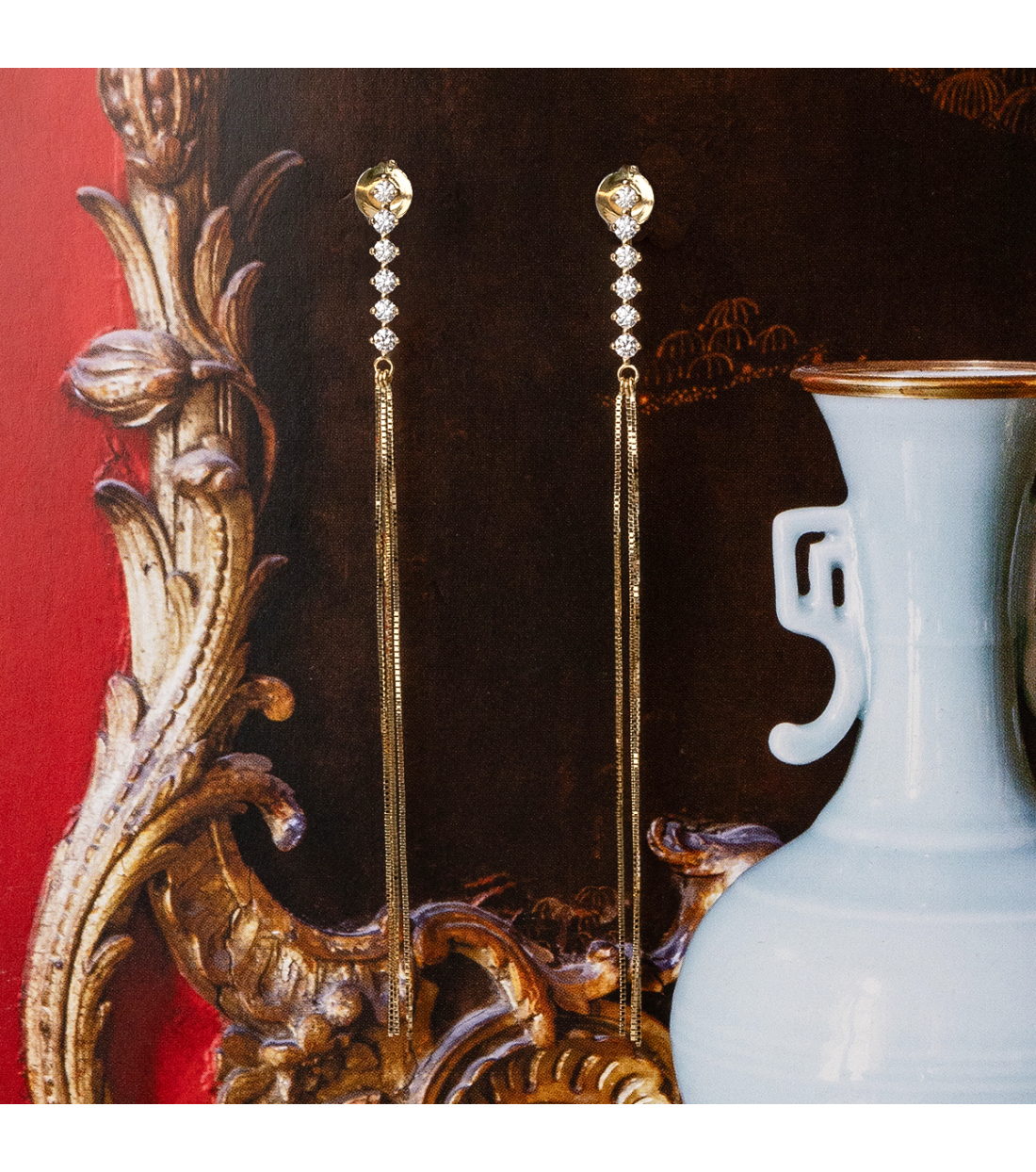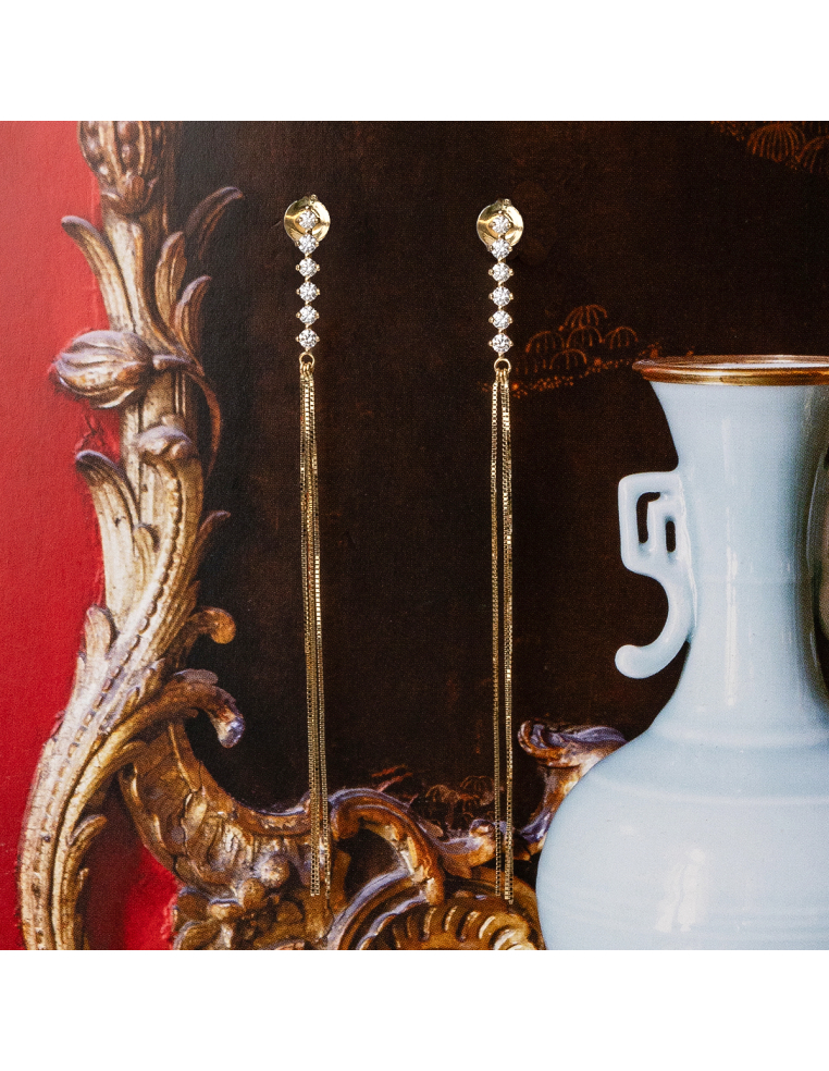 Pendientes largos "Béatrice" tres tiras de oro amarillo de 18kt. con diamantes talla brillante (0,40 Cts.). Cierre a presión. Perfectos para un regalo inolvidable.