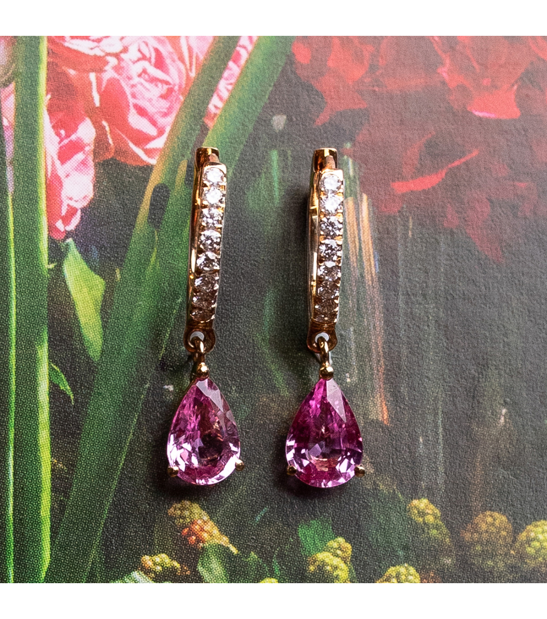 Pendientes "Olaya" de oro rosa de 18Kt compuesto por mini aro con diamantes talla brillante 0,10Cts. y colgante de zafiro rosa talla pera 0,92Cts. Un toque de distinción incomparable.
