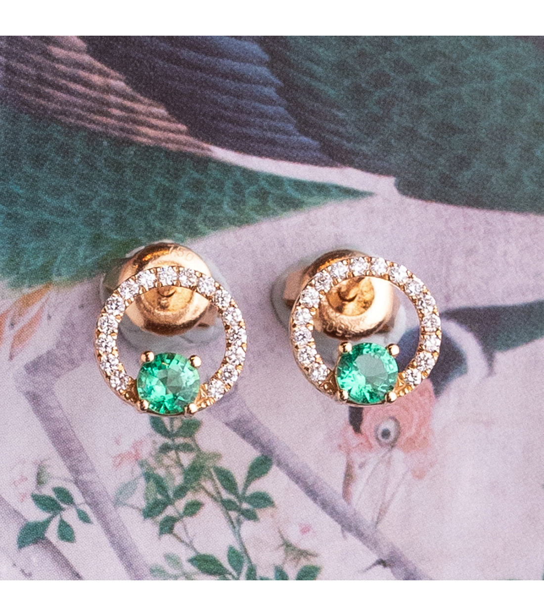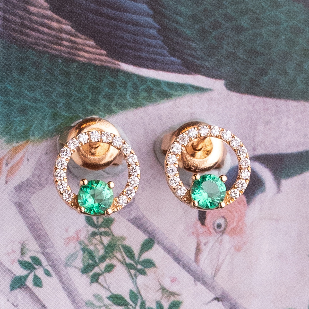 Pendientes "Ofelia" de oro rosa de 18Kt en forma de círculo con diamantes talla brillante 0,16Cts. y esmeraldas talla brillante 0,29Cts. Un diseño que encapsula la belleza natural y la sofisticación eterna.