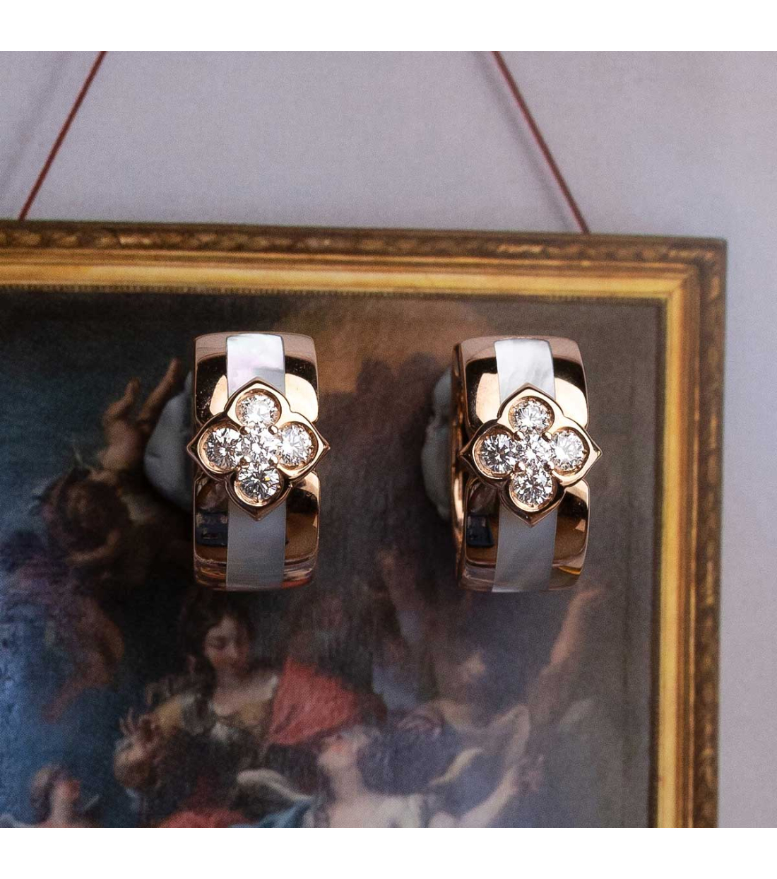 Pendientes de aro "Florencia" de oro rosa de 18Kt con resina de madre perla y diamantes talla brillante 0,48 Cts. Un diseño sofisticado y versátil, perfecto para realzar tu estilo diario con un toque de lujo.