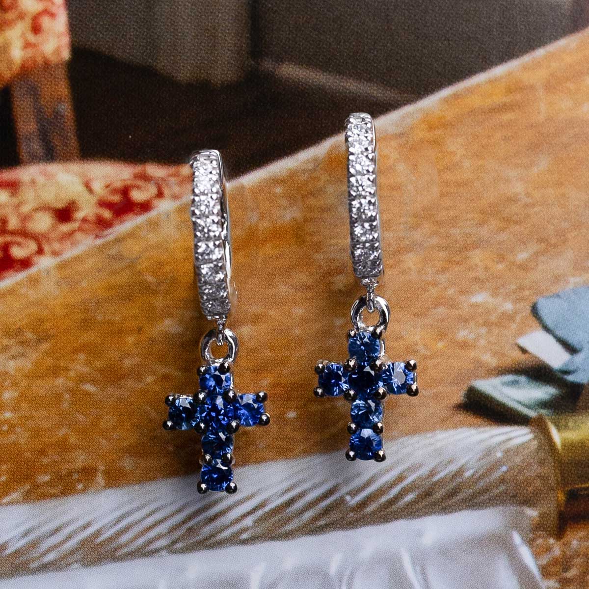 AROS CON CRUZ "CASEY" DE ORO, DIAMANTES Y ZAFIROS