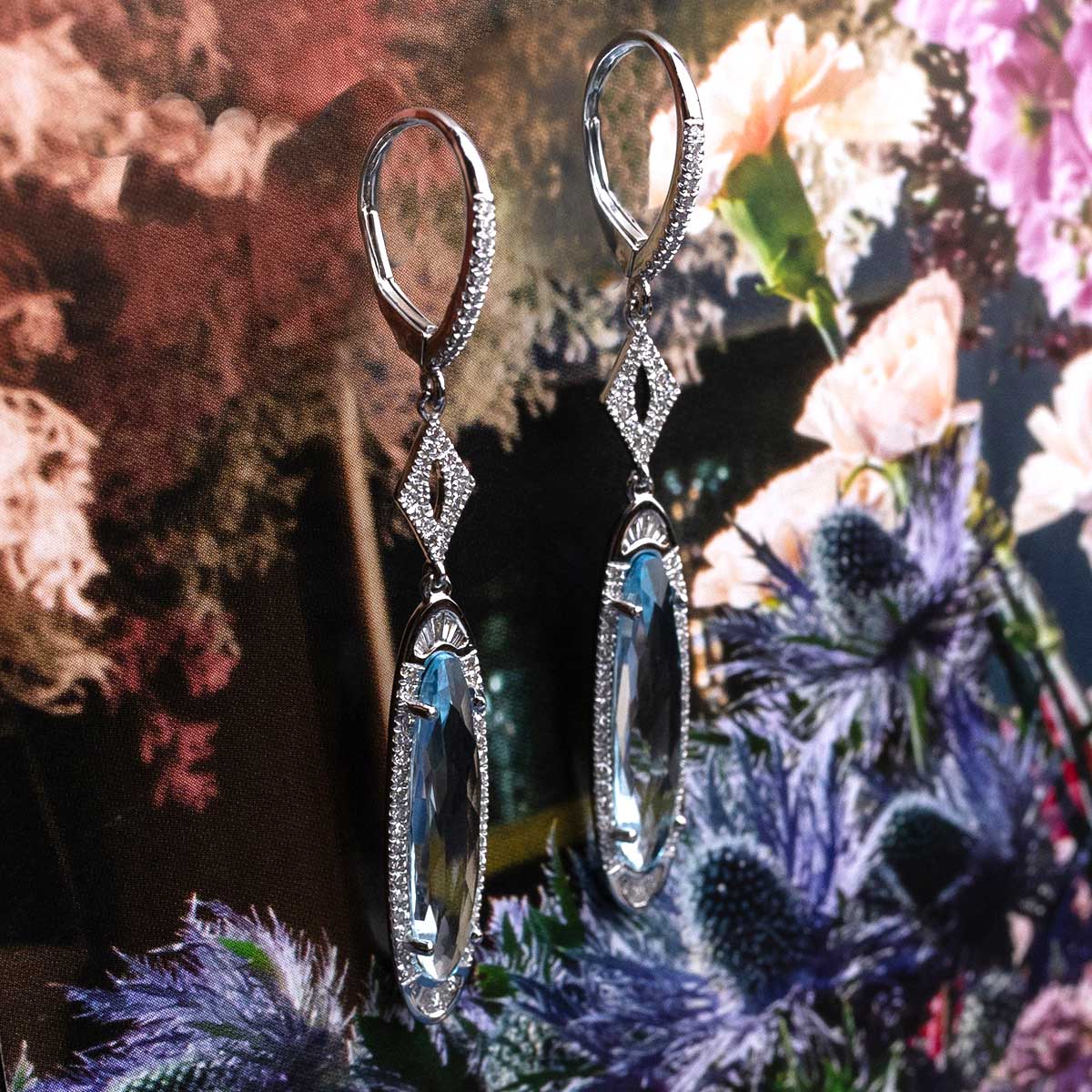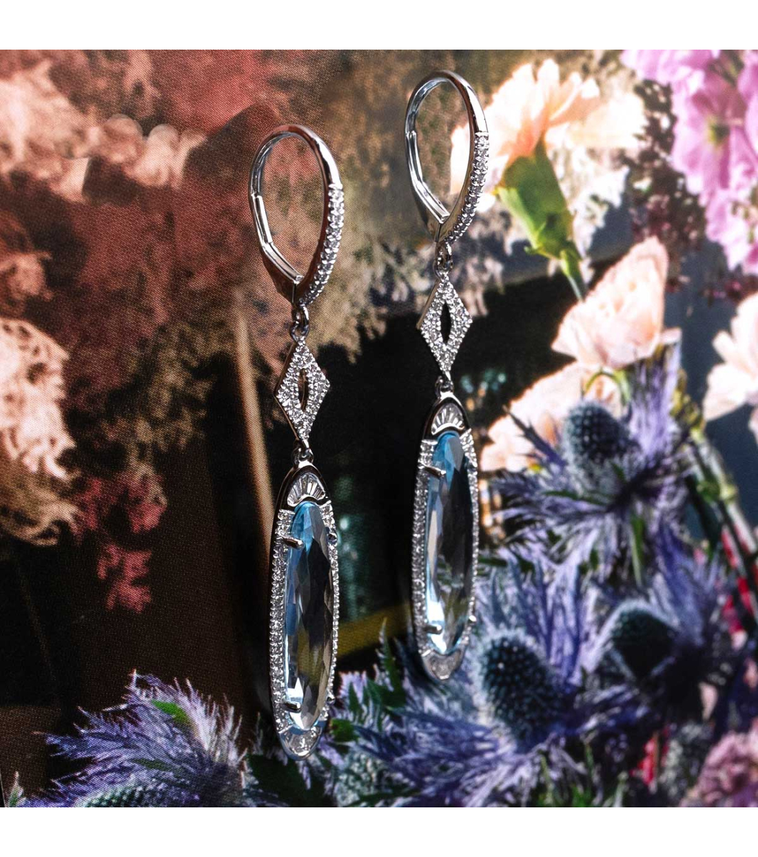 Pendientes "Elodie" de oro blanco de 1ª Ley de 18 Kt. con diamantes 0,42 cts. y topacio azul. Donde la elegancia es protagonista.