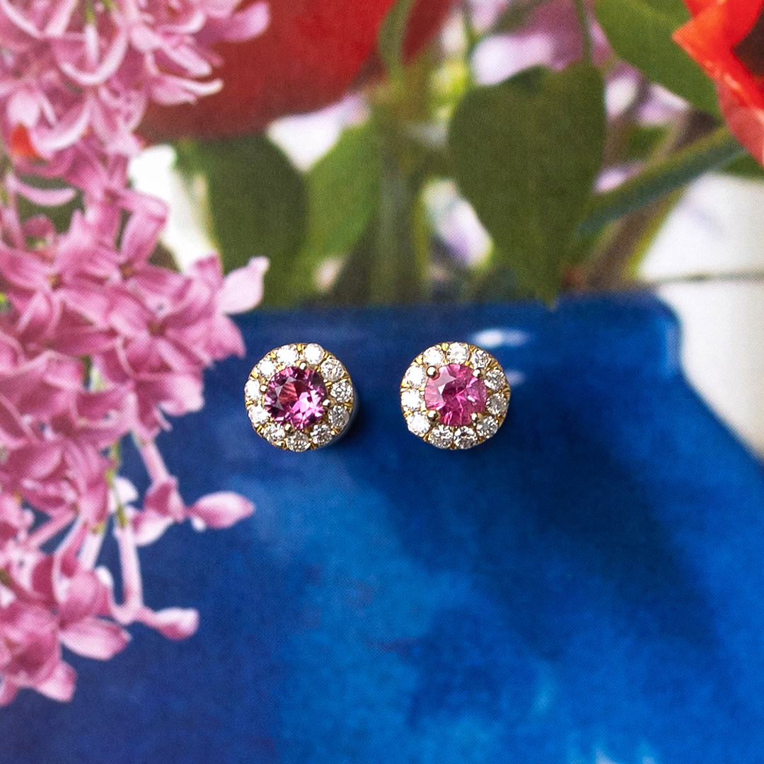Pendientes "Violeta" de oro amarillo de 18Kt., rubí y diamantes. Perfectos para añadir un toque de lujo y sofisticación a tu look.