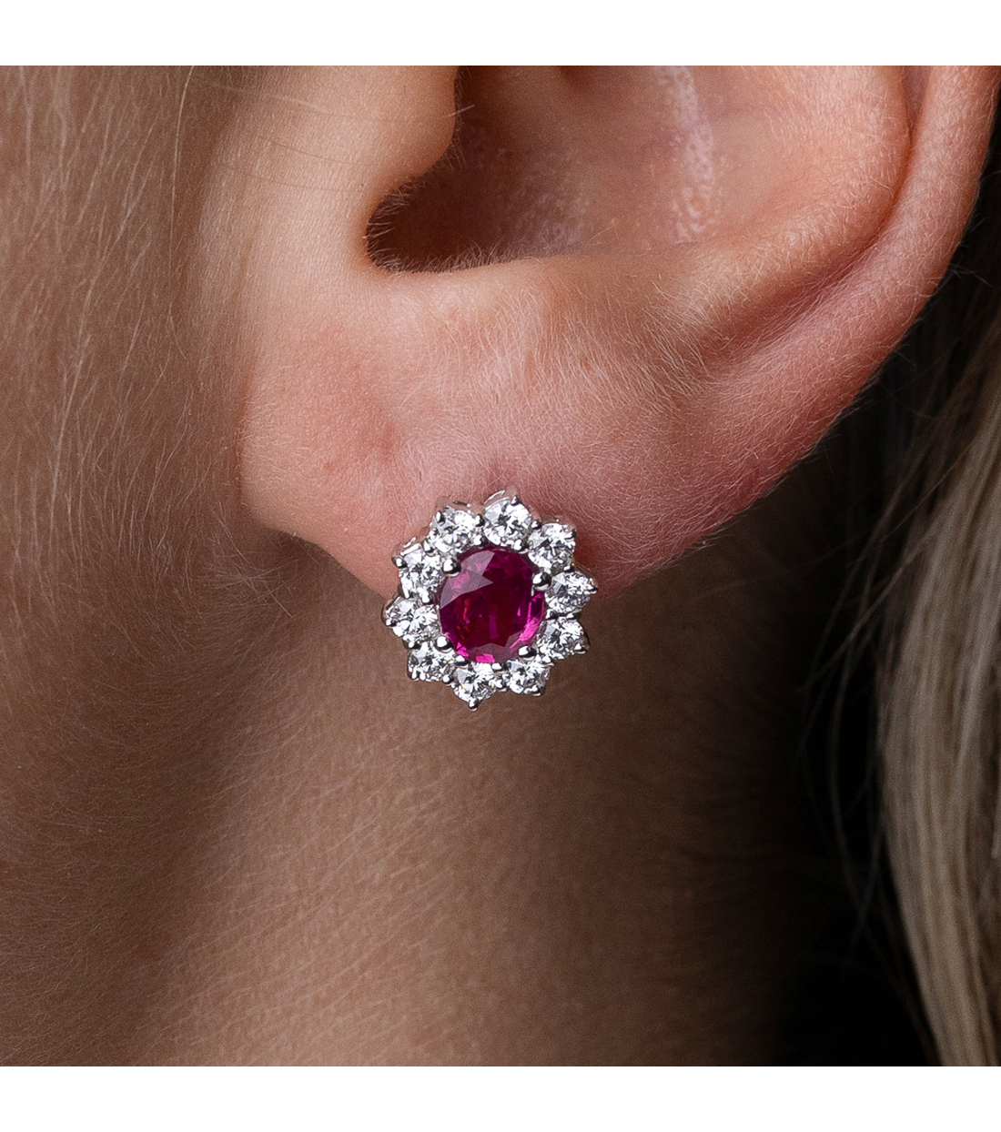 Pendientes "Medeleine" de oro blanco de 1ª Ley de 18Kt con diamantes talla brillante 0,86 Cts. y rubí talla oval 1,15 Cts. Belleza clásica reinterpretada.